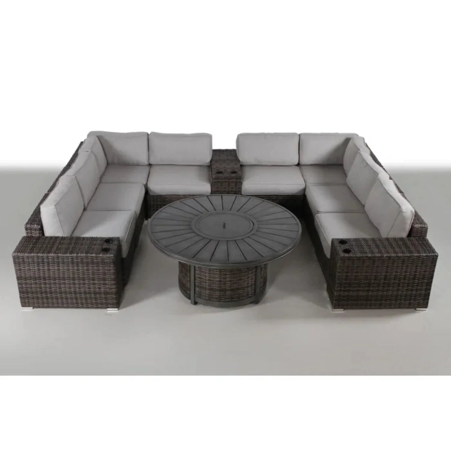 Set composition: 12‑piece outdoor seating group — includes two modular sectional pieces, one sofa, a round fire pit, and 18 cushions.