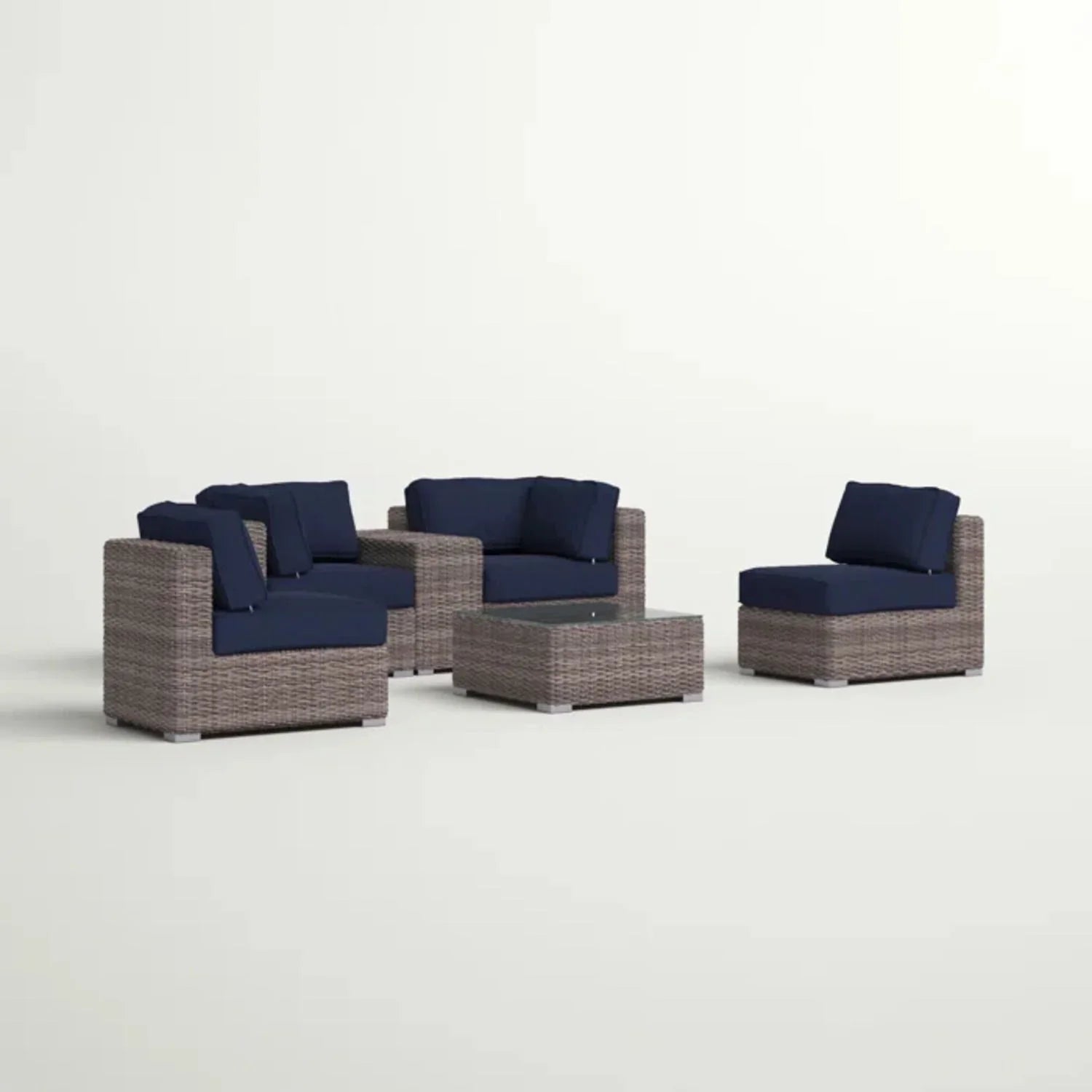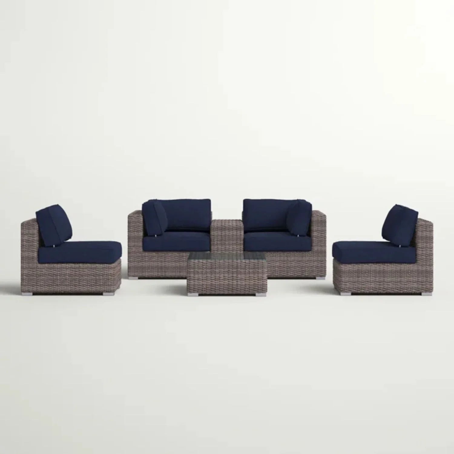 Wicker Seating Group Set With Table And Cushions - Blue / 3 Pc. L-Shaped Sectional, Chair, Table is backordered and will ship as soon as it is back in stock.