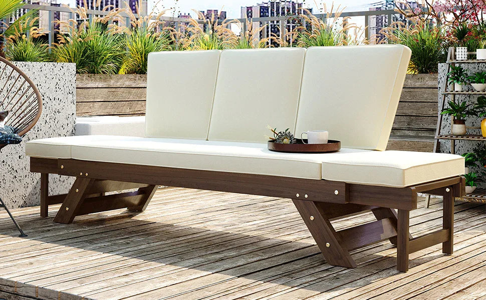 Wipe the wood frame with a soft, damp cloth and dry thoroughly. Spot‑clean cushion covers according to the fabric care label — for outdoor cushions, remove loose dirt and hose off when needed, then air dry completely before returning to the frame. To prolong life, store cushions indoors or under a protective cover during prolonged wet or freezing conditions.