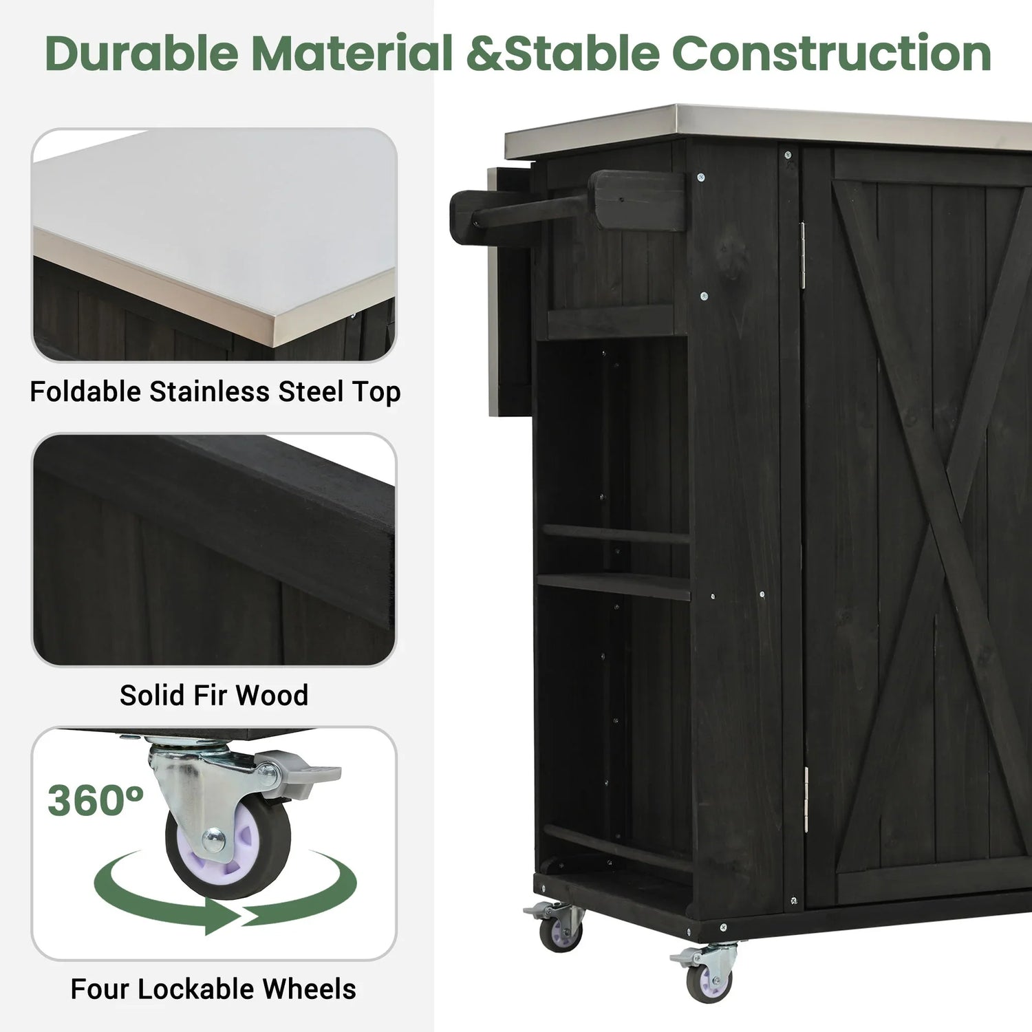 - Premium Foldable Top - Featuring a sleek stainless steel countertop, this island provides a durable, heat-resistant surface for food preparation or serving. Its foldable half-top design allows you to expand your workspace when needed and conserve space when not in use, perfect for compact areas.