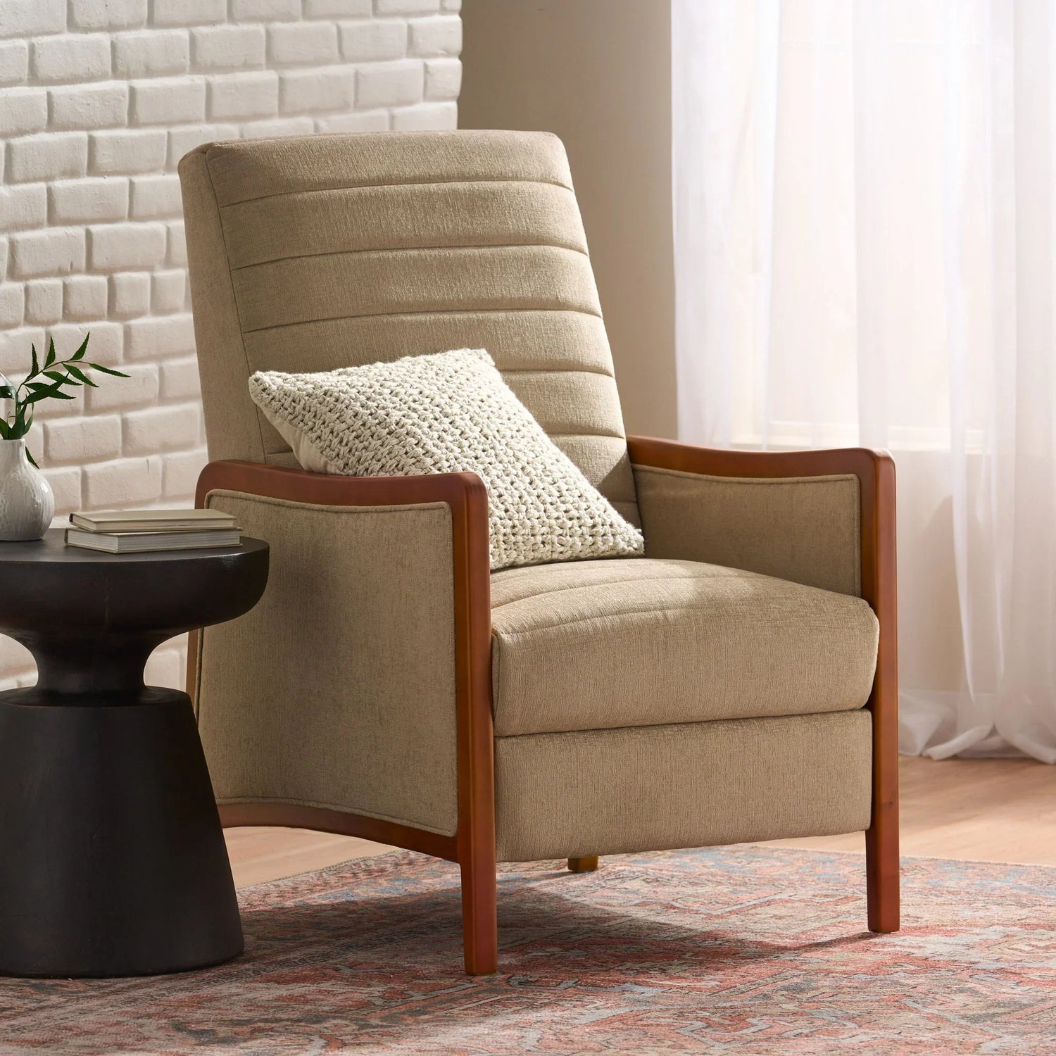 Mid Century Modern Channel Stitch Wood Pushback Recliner - Sand