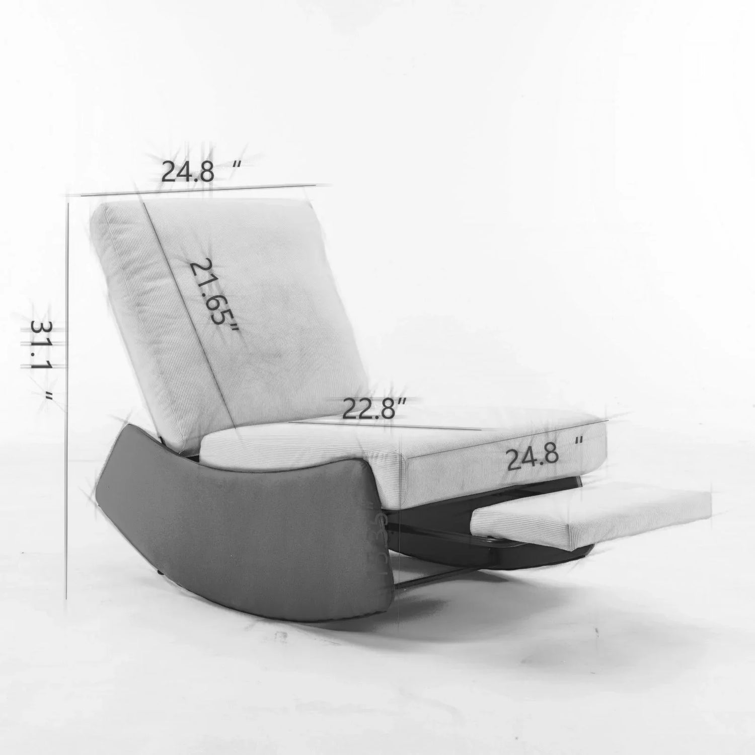 This chair uses mixed materials typical for modern upholstered seating. For safe use, follow the included assembly and operation instructions; ensure recline and leg‑support mechanisms are fully engaged before sitting. Place the chair on a level surface and allow adequate clearance behind and around the rocker for full motion. If children will use the chair, supervise use and follow any anti‑pinch guidance supplied with the product.