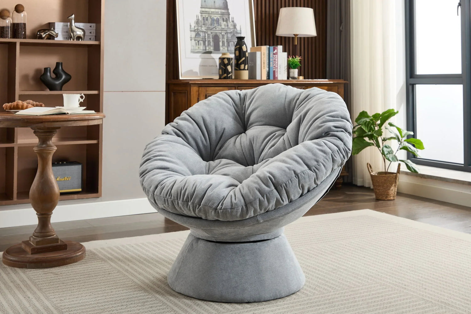Perfect for anyone who wants a cozy, statement lounge chair for a living room, bedroom, or reading nook — this oversized swivel accent chair combines the relaxed comfort of a papasan with the convenience of a 360° rotating base. The deep, tufted cushion invites you to curl up with a book or swivel to face conversation without lifting a finger, while the barrel silhouette reads modern and approachable in contemporary or casual interiors.