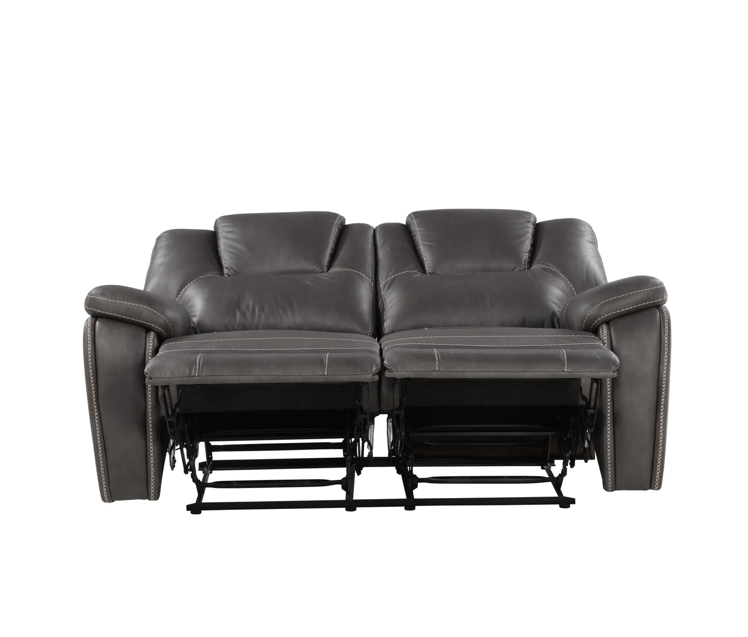 The Katrine charcoal PU manual loveseat is designed for two — a compact reclining sofa that fits apartment living rooms, media rooms, or cozy den corners where comfort matters as much as appearance. Wrapped in charcoal faux-leather with contrasting baseball-style stitching and extra-padded arms and backs, it gives a contemporary, slightly sporty look while staying family-friendly and easy to maintain.