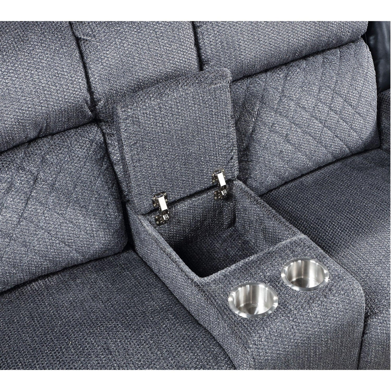 Use it as the primary seating for a small media setup or as a cozy companion sofa in an open-plan living area. Plush, divided back cushions and padded armrests create support for long stretches of sitting, while the center console with two cupholders keeps beverages and remotes within reach. Constructed with durable fabric upholstery and visible black trim, the piece balances comfort-focused construction with an easy-to-style silhouette.