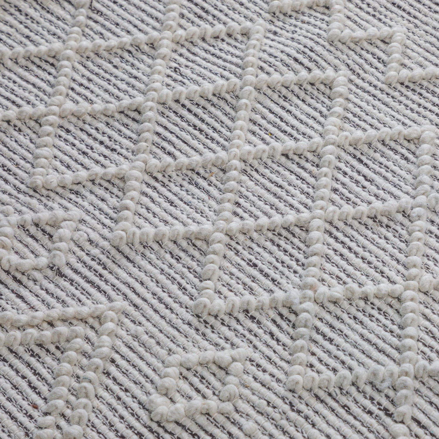 • Design and Colors: This rug features a detailed diamond pattern, complemented by a hand-knotted fringe, offering a stylish and elegant appearance.