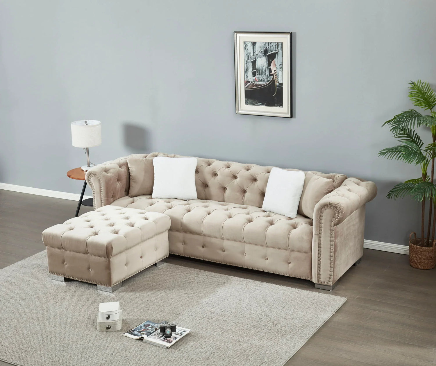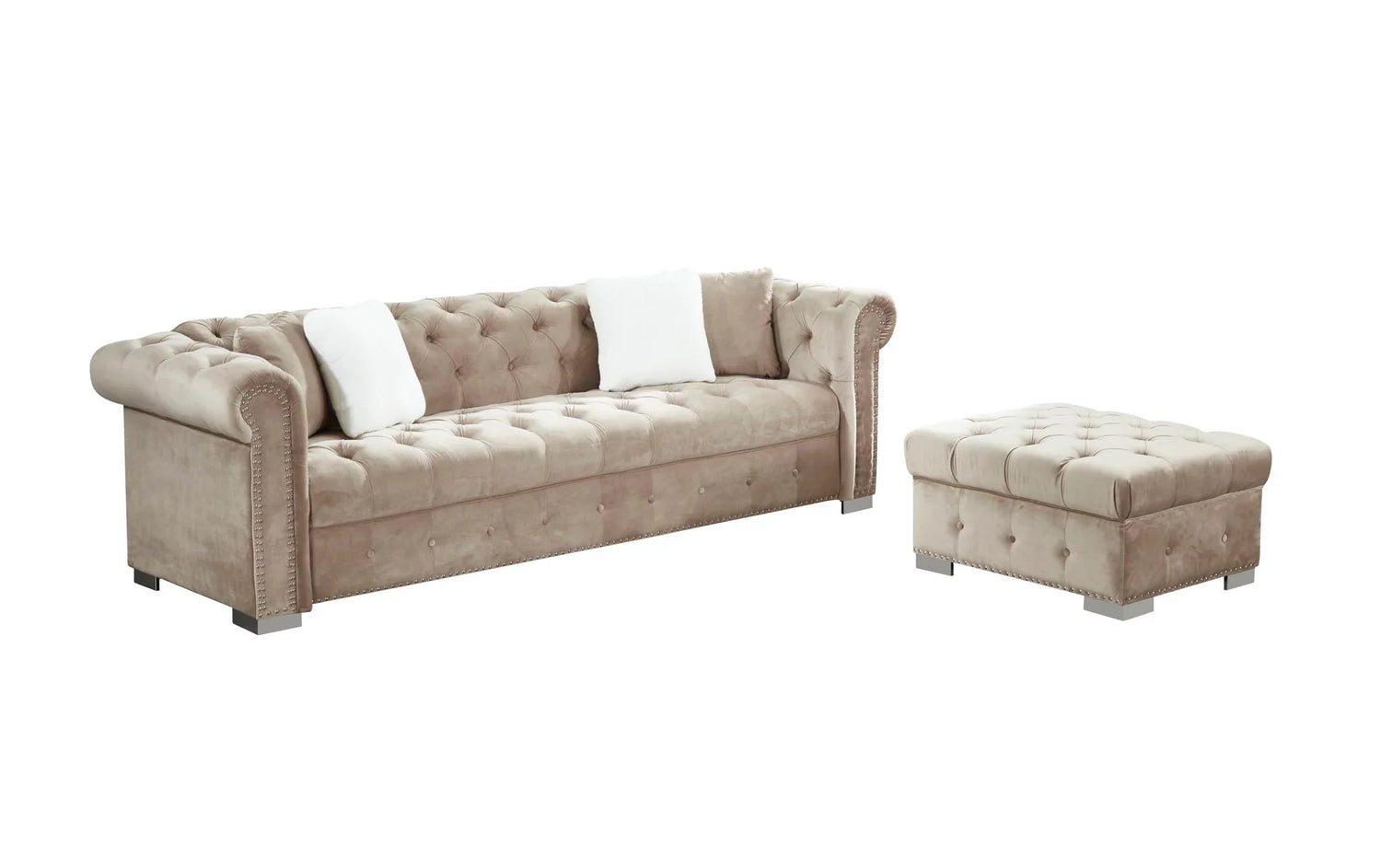 Construction & materials: Velvet-texture fabric upholstery with deep button tufting; high-density sponge seat cushions; rolled arms with studded nailhead trim; chrome-finish low profile feet.