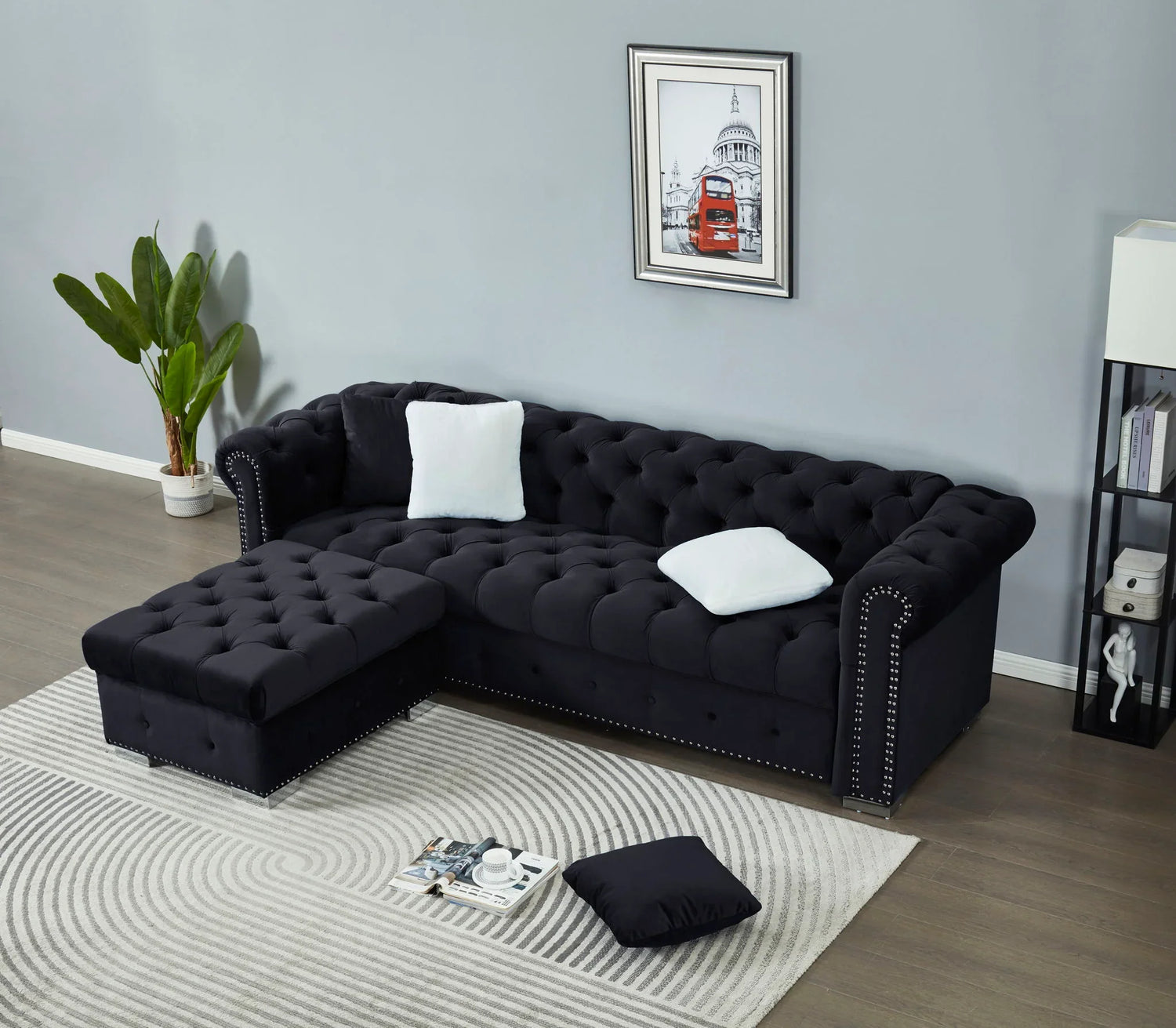Designed for families and style-minded hosts who want an inviting lounge area with a refined, modern look, this 4 Seater Oversized L Shaped Reversible Sectional Sofa fits living rooms and open-plan spaces that need generous seating without feeling bulky. The velvet-texture upholstery and deep button tufting create a plush, hotel‑inspired silhouette while the reversible chaise lets you orient the L to match your room layout.