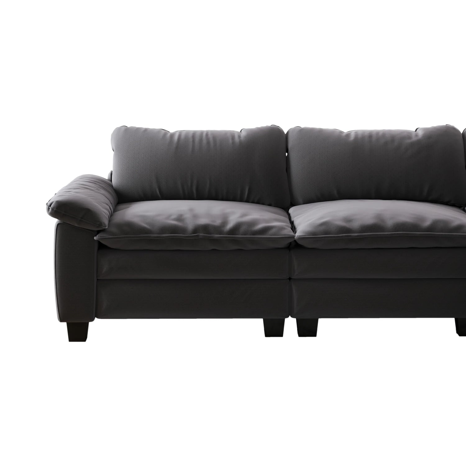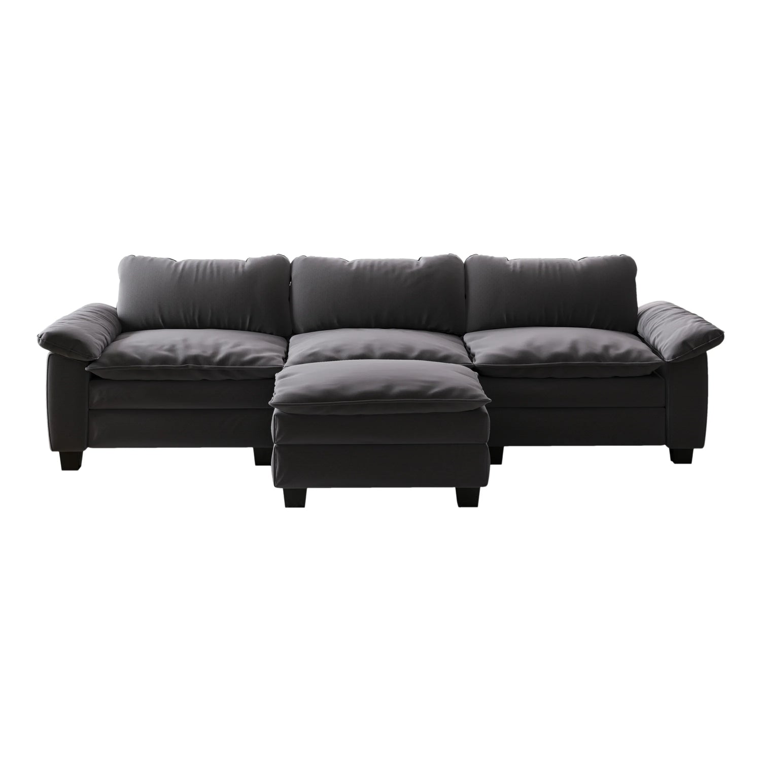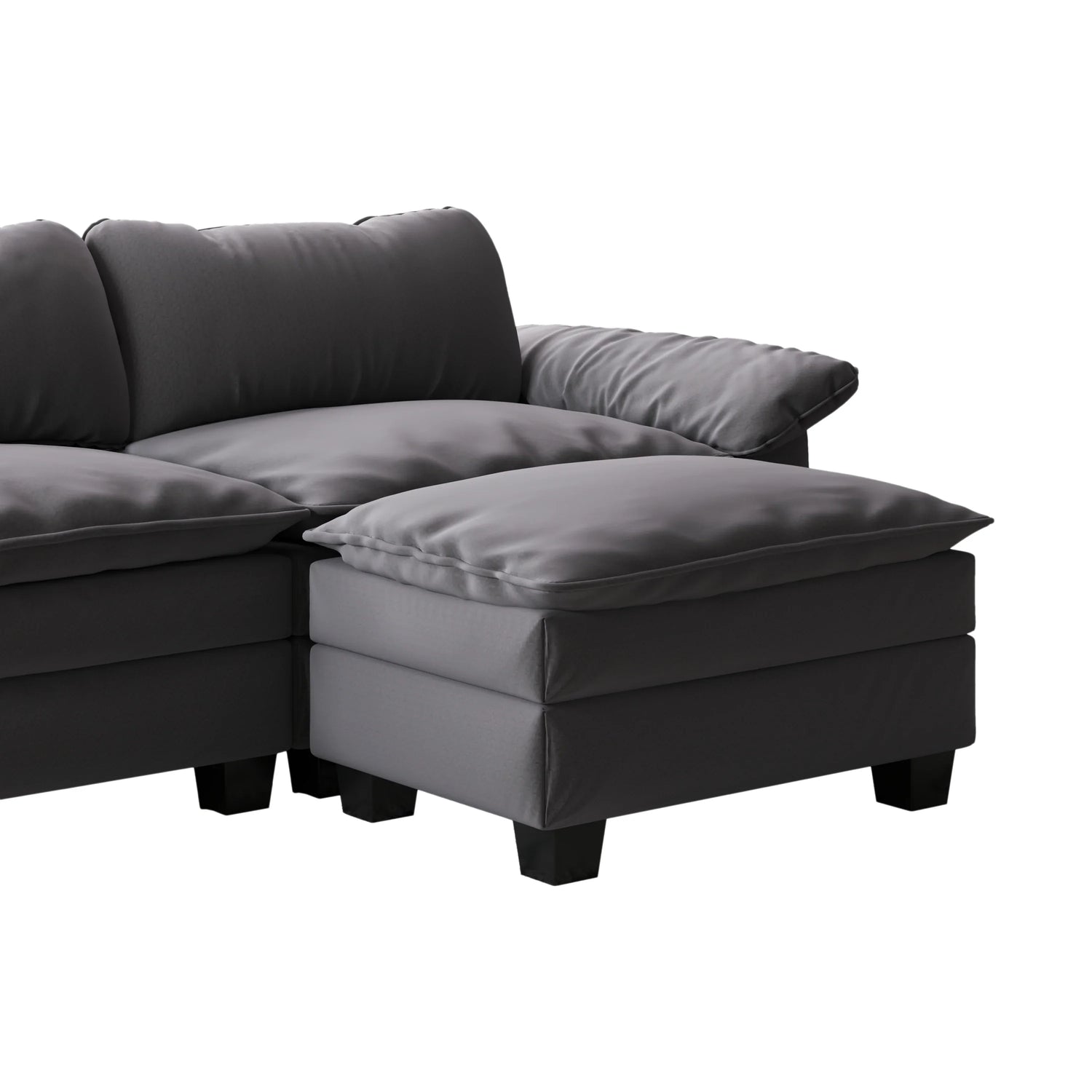 Free-combination sectional: seats connect via a metal sheet connector; ottoman is freestanding and can be removed for flexible layouts. Back cushion covers are removable for easier cleaning. No built-in storage. Assembly required; all tools, parts, and instructions are included.