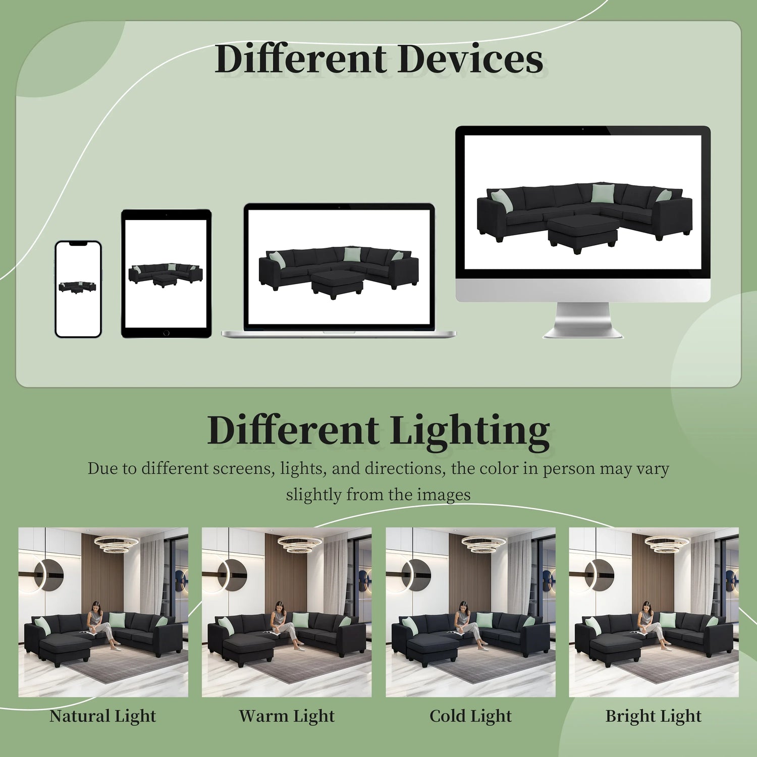 Designed as a substantial indoor seating solution, this sectional benefits from a mixed wood-and-metal frame for long life. For safety, secure the sectional pieces together per assembly instructions and ensure adequate floor clearance when moving through doorways: its large footprint is best suited to living areas that can comfortably accommodate a piece roughly 112" × 87". If the product will be placed near stairways or elevated surfaces, follow anti-tip guidance in the included manual and avoid placing heavy items on the ottoman when used as a stepping surface. Color tones and natural fabric texture may vary slightly from images and between production runs; screens may also display the color differently.