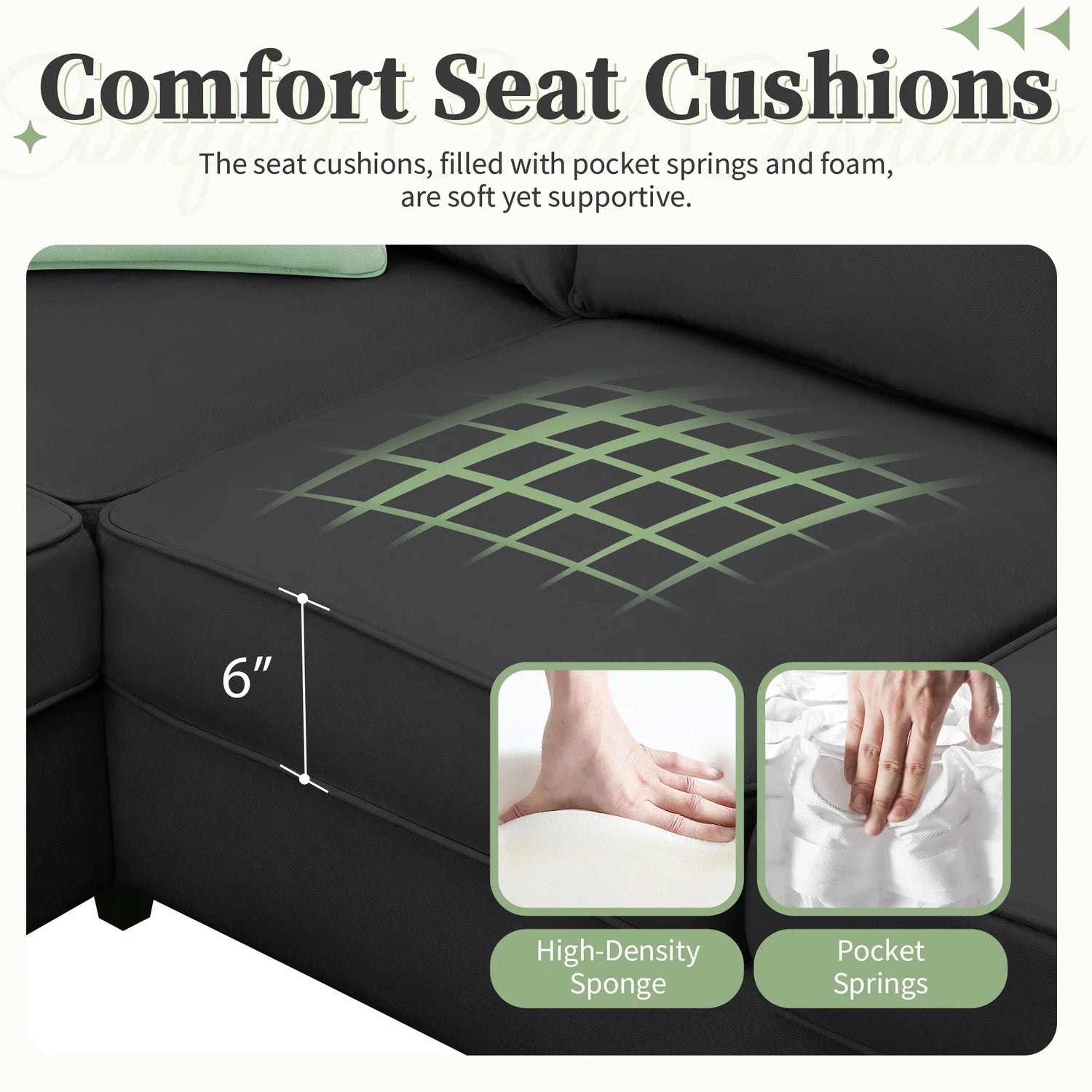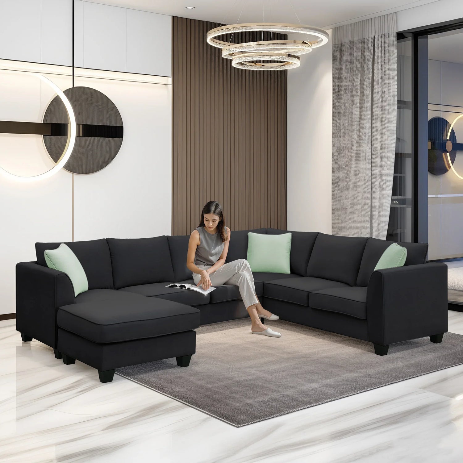 L Shaped Sectional Sofa with Ottoman and Cushions Black