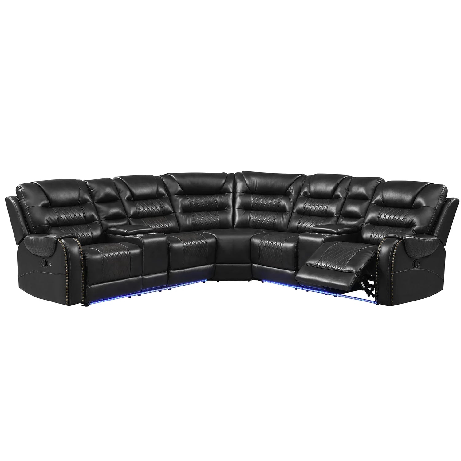 Use it as a multi-seat lounging hub: manual recline lets guests stretch out on demand, and integrated LED light strips add a cinematic ambiance that lifts evening gatherings. The frame and foam-filled seats deliver deep, supportive comfort day to day, while faux-leather upholstery keeps maintenance simple and spill cleanup straightforward.