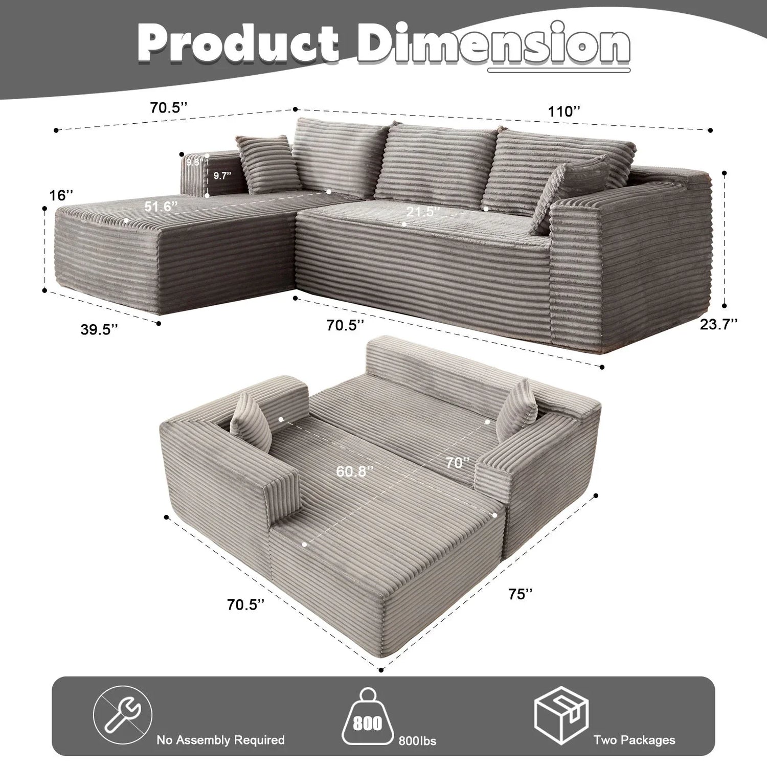 Compression Sectional Couch With Comfy Chaise, Boneless L Shape Sofa With Deep Seat, Minimalist Modular Couches Sleeper - Gray
