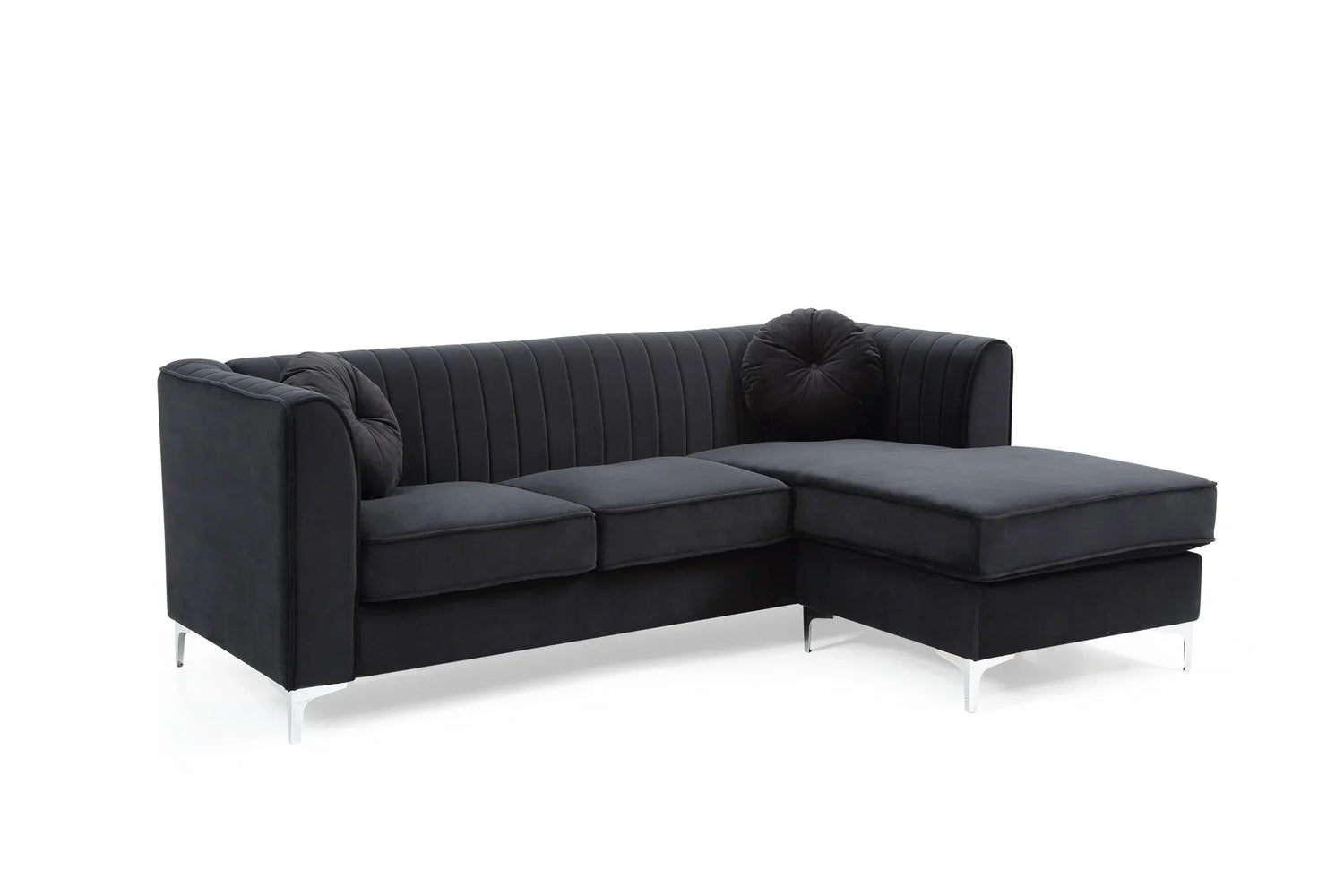 Built with pocketed coil seat cushions wrapped in foam and dacron fiber, the Delray delivers supportive, long-lasting comfort that resists sagging while retaining a tailored look. Polished chrome legs and channel-tufted back detailing bring a subtle, contemporary shine—an elevated design that reads luxe without being fussy. The included round accent pillow adds a playful, finished touch.