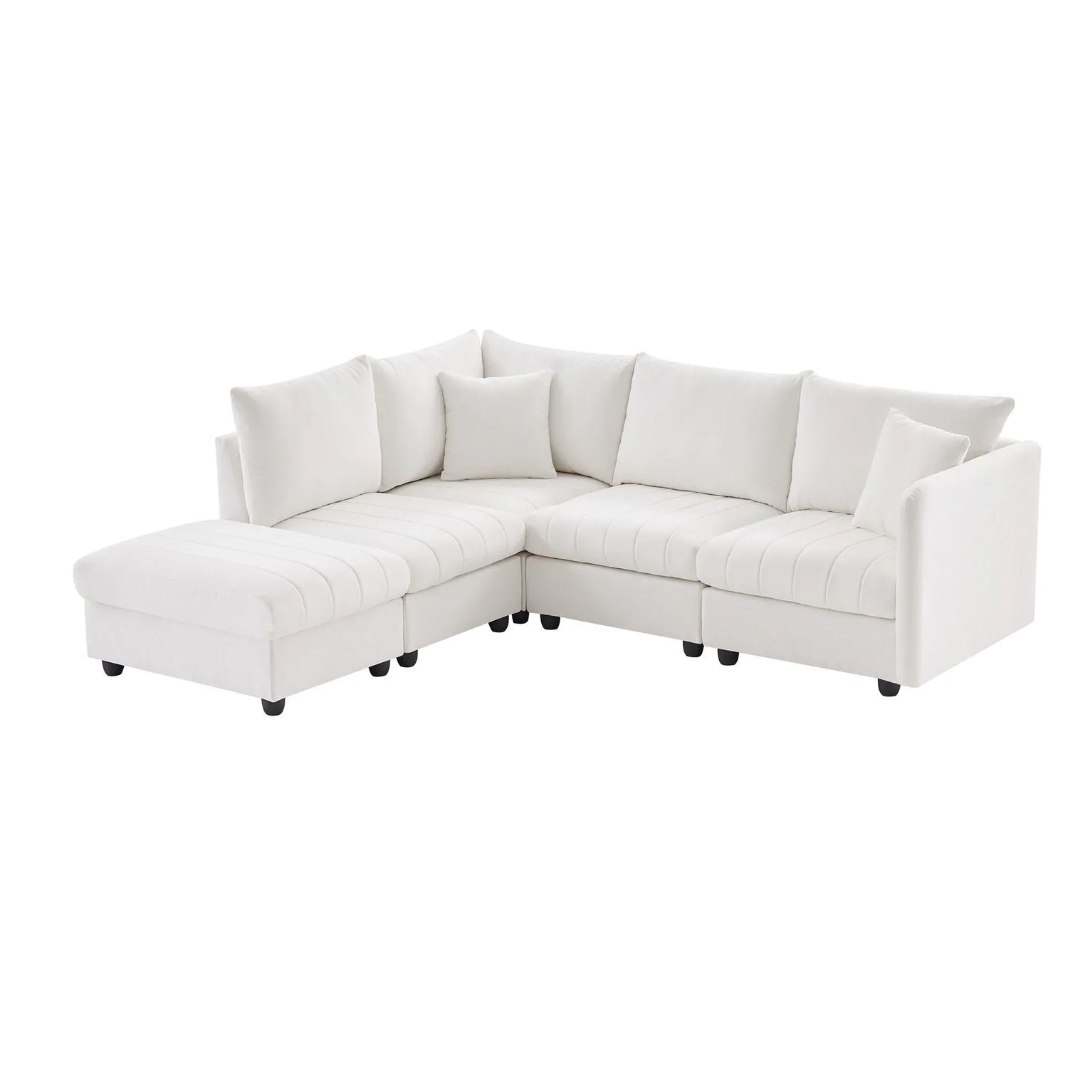 Modern Sectional Sofa With Vertical Stripes, 2 Pillows, 5 Seat Couch With Convertible Ottoman, Various Combinations, L-Shape Indoor Furniture - White