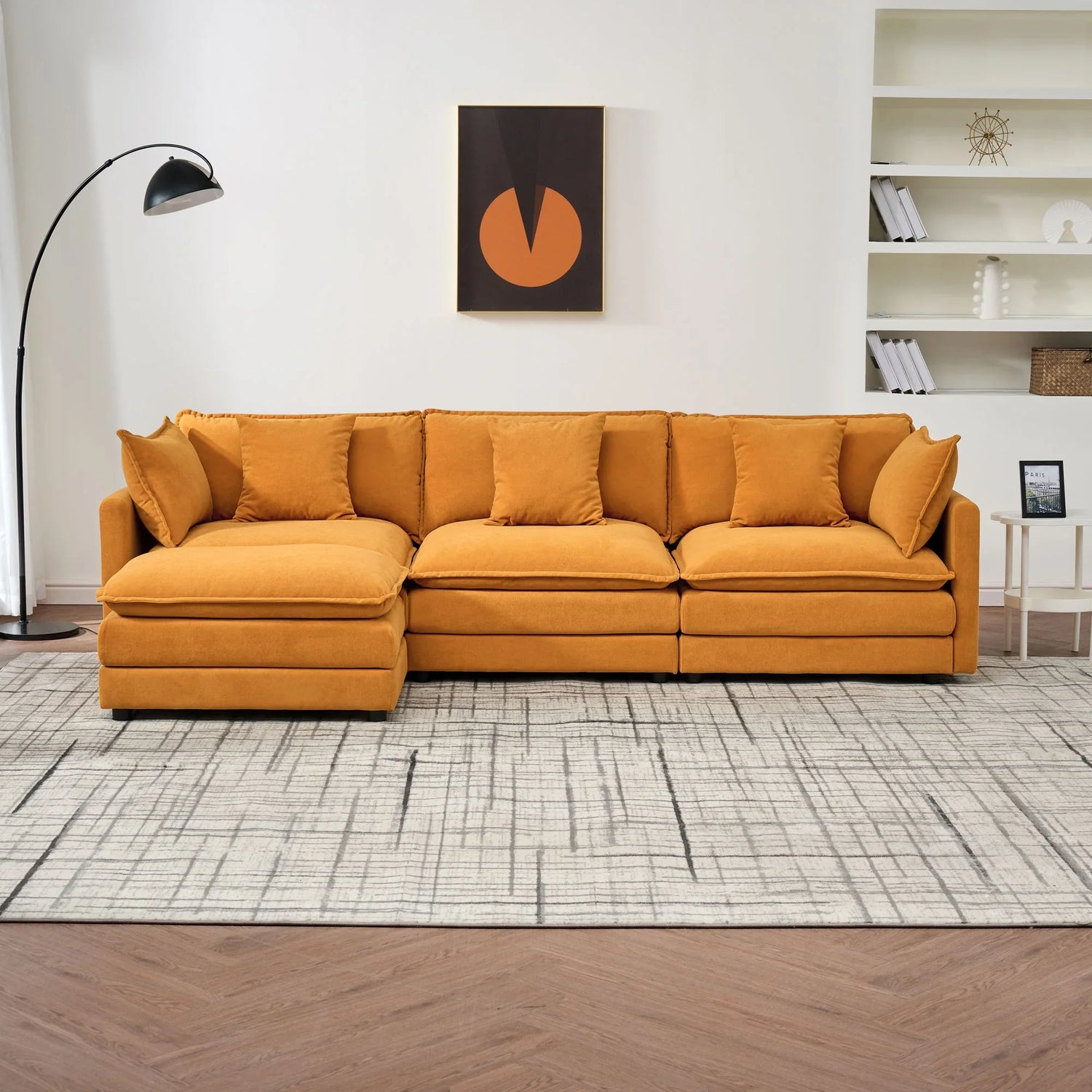 Modular Chenille L Shaped Sofa With Ottoman, Deep Seat, Cushions - Orange