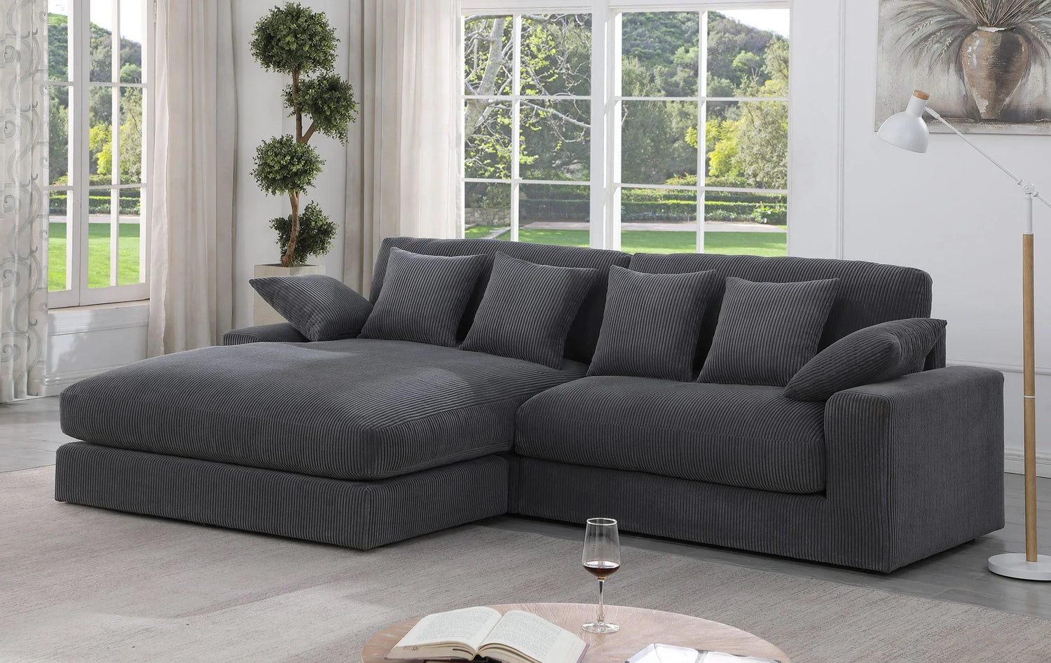 - Experience the epitome of comfort and style with our Mystic Corduroy Reversible Sectional Sofa Chaise. With a reversible chaise, you have the flexibility to configure your seating arrangement to suit your space and preferences. Whether you want to lounge on the left or right side, this sectional adapts to your needs. Included with the sectional are six plush throw pillows, adding an extra layer of coziness to your seating experience. These pillows not only provide support but also contribute to the sofa's overall aesthetic appeal. Featuring a wide seat width and seat depth, this sectional offers ample room for you and your guests to sink into comfortably and lounge while enjoying your favorite movie. Our Mystic Corduroy Reversible Sectional Sofa Chaise is more than just furniture; it's an invitation to unwind, socialize, and enjoy your living space to the fullest.