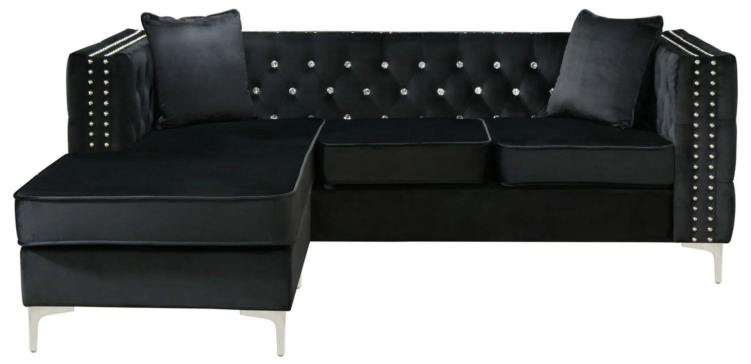 The Paige Sofa Chaise is designed for anyone who wants a statement seating piece that’s both elegant and livable — ideal for city apartments, cozy living rooms, or a stylish guest suite. Its low-profile chaise layout provides a relaxed spot for lounging or entertaining, while the tufted back and chromed steel legs bring a modern-glam vibe that anchors contemporary and transitional decor.