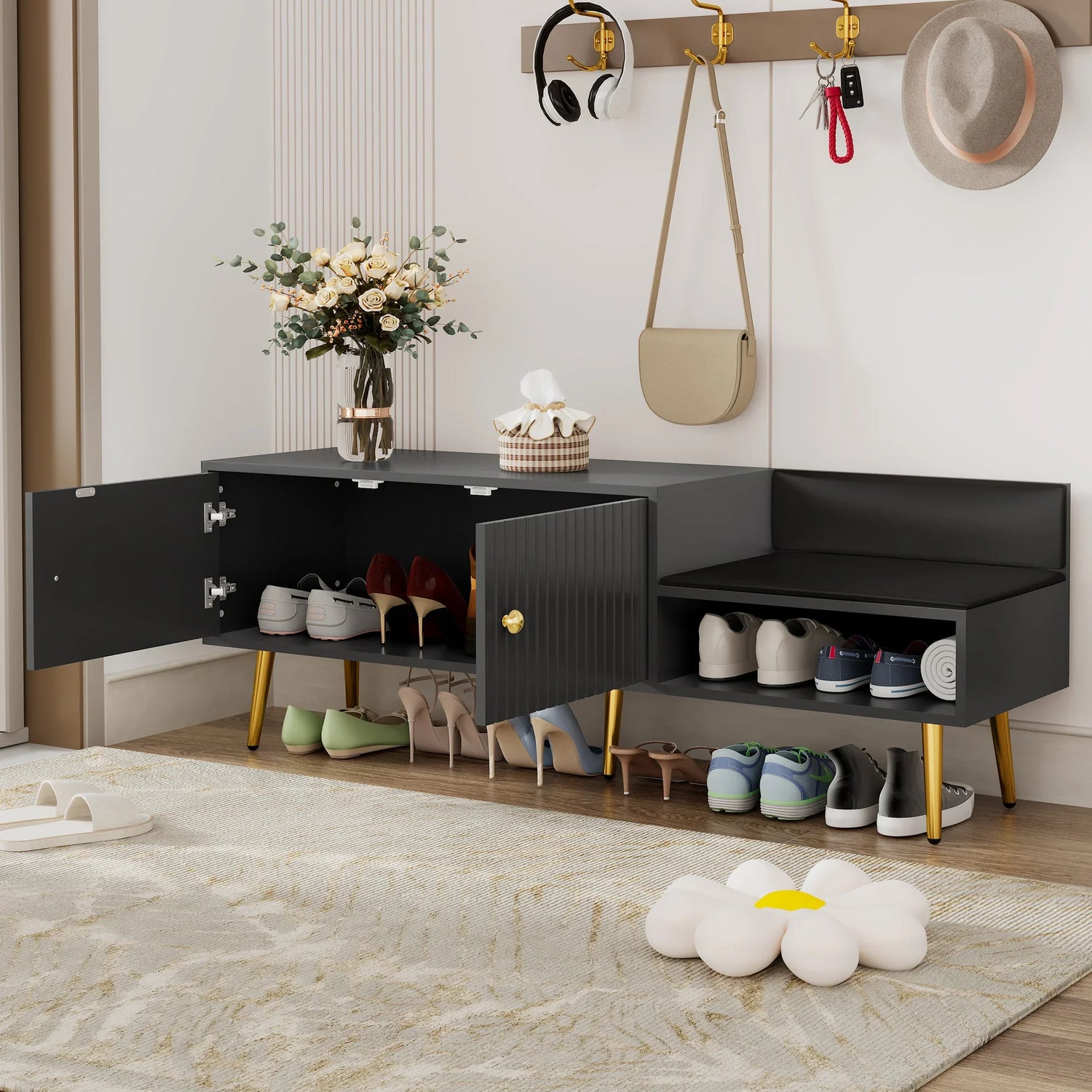 - Stunning Details: This modern storage bench of clean lines going with any environment is a sleek and functional addition to any contemporary space. Crafted with sophistication in mind, this bench features metal handles and metal legs, adding a touch of industrial flair to its design. The door panels are intricately carved with grooves, enhancing its visual appeal and creating depth and texture. Perfect for storing shoes or other essentials, this bench seamlessly combines style and practicality.
