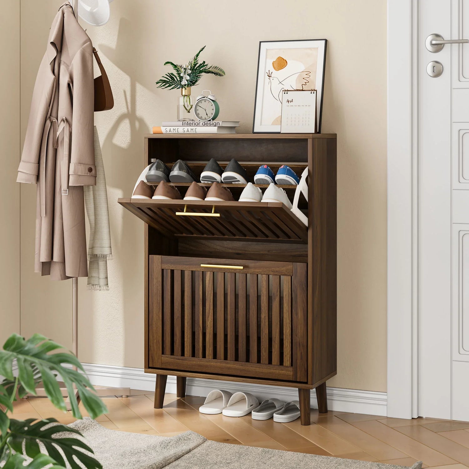 Medieval - Modern Shoe Storage Cabinet With 2 Flip Drawers And Fence Design - Walnut