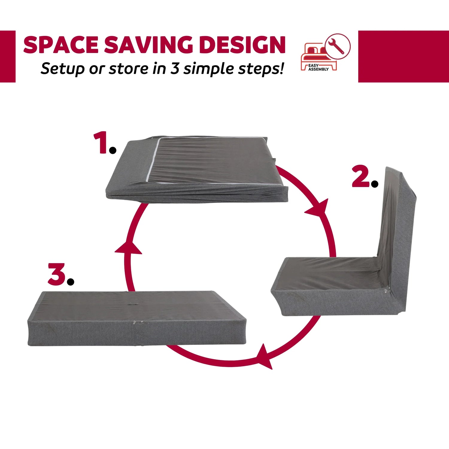 Ths 9 in. Foldable Metal Mattress Foundation Box Spring features a portable bed base with all metal construction, providing a strong foundation suitable for any mattress. The bed base can be placed directly on the floor or used as a box spring for a higher profile. When not in use, the innovative design folds in half and collapses for convenient portability and compact storage. Whether you use it as a permanent solution or for accomodating guests, you can easily set up the comfy this Foundation in a matter of minutes! In addition, a detachable non-slip linen cover is also included for added style and protection.