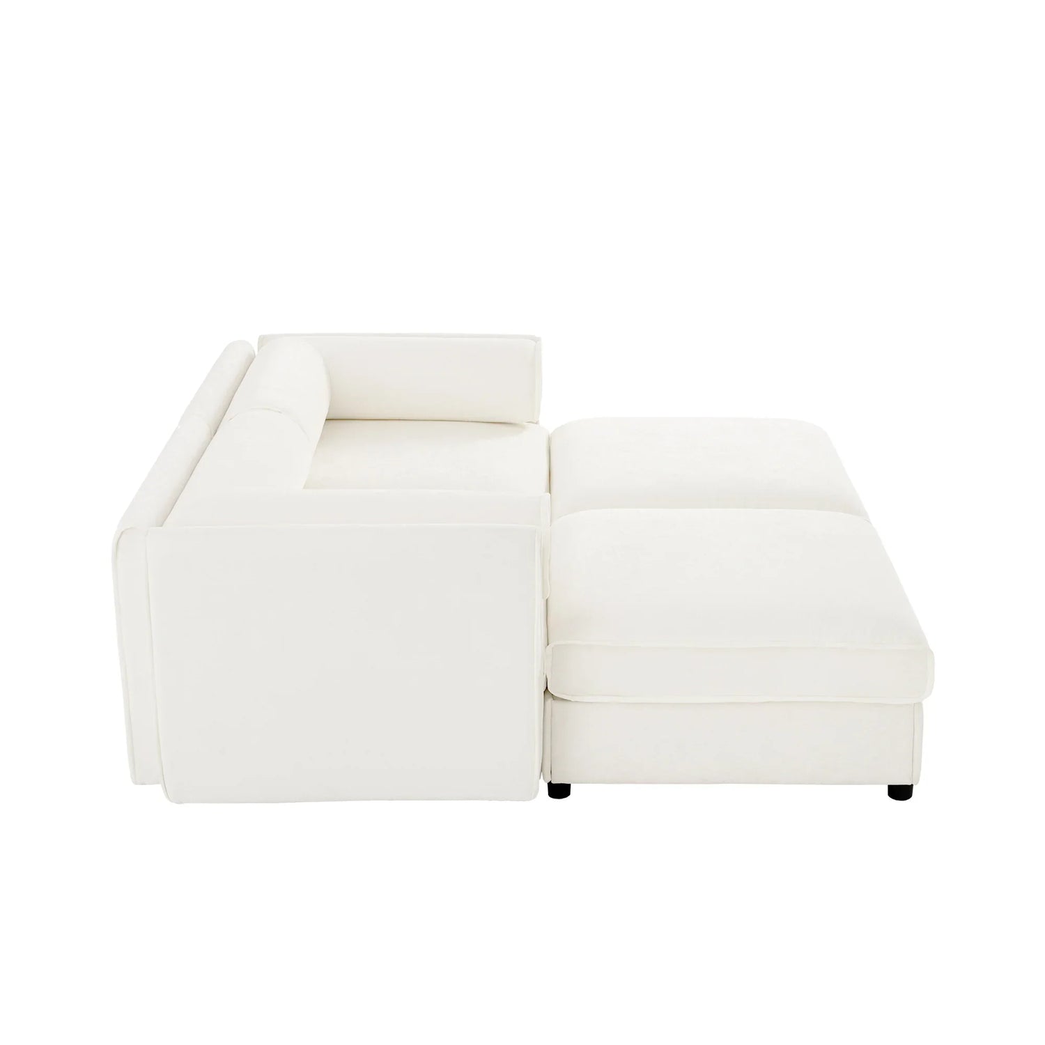 Upholstered in soft white chenille with a subtle textured nap, the loveseat reads fresh and contemporary while still feeling warm and tactile. Visible details in the imagery—low-profile black feet, clean straight lines, and cylindrical bolster cushions—give the piece a minimalist silhouette that pairs easily with Scandinavian, modern, or transitional interiors. The modular nature of the ottomans makes this a versatile seating option for small spaces that need flexible layouts.