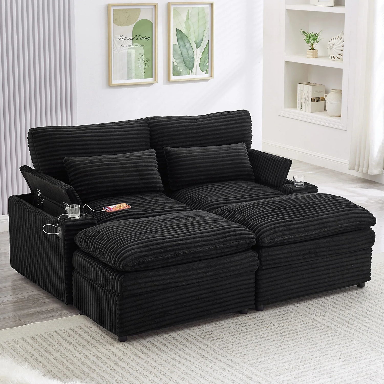 Convertible Loveseat Sofa With Storage, USB Ports, Cup Holders - Black