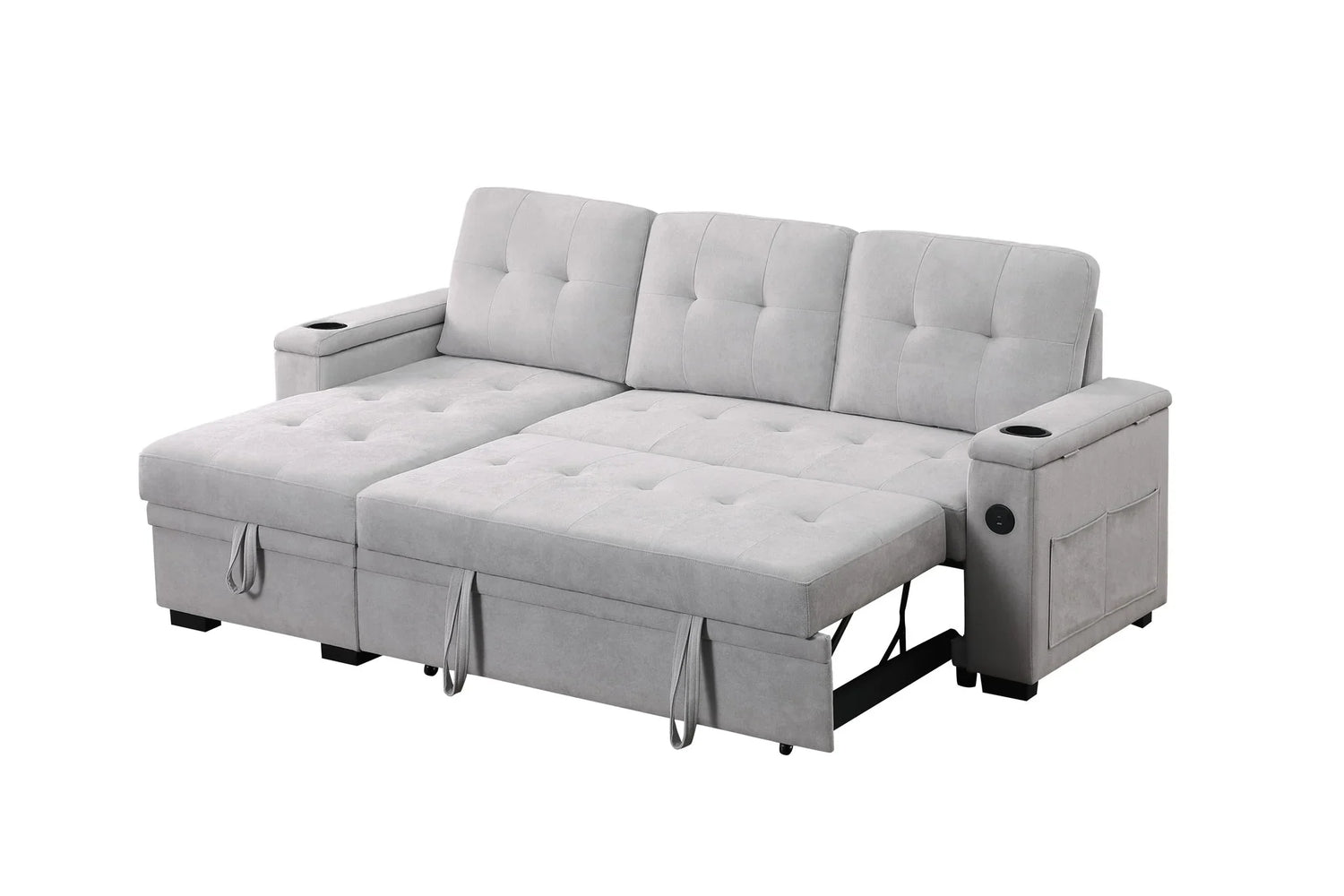Ashlyn II - Woven Fabric Reversible Sleeper Sectional Sofa With Storage Chaise, Storage Arm, Cup Holder, Charging Ports, Side Pockets, and Pocket Coil Seating - Gray