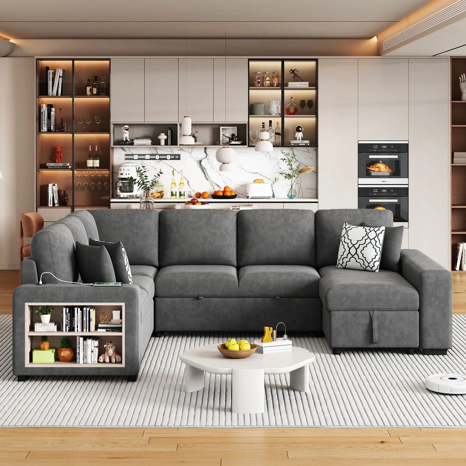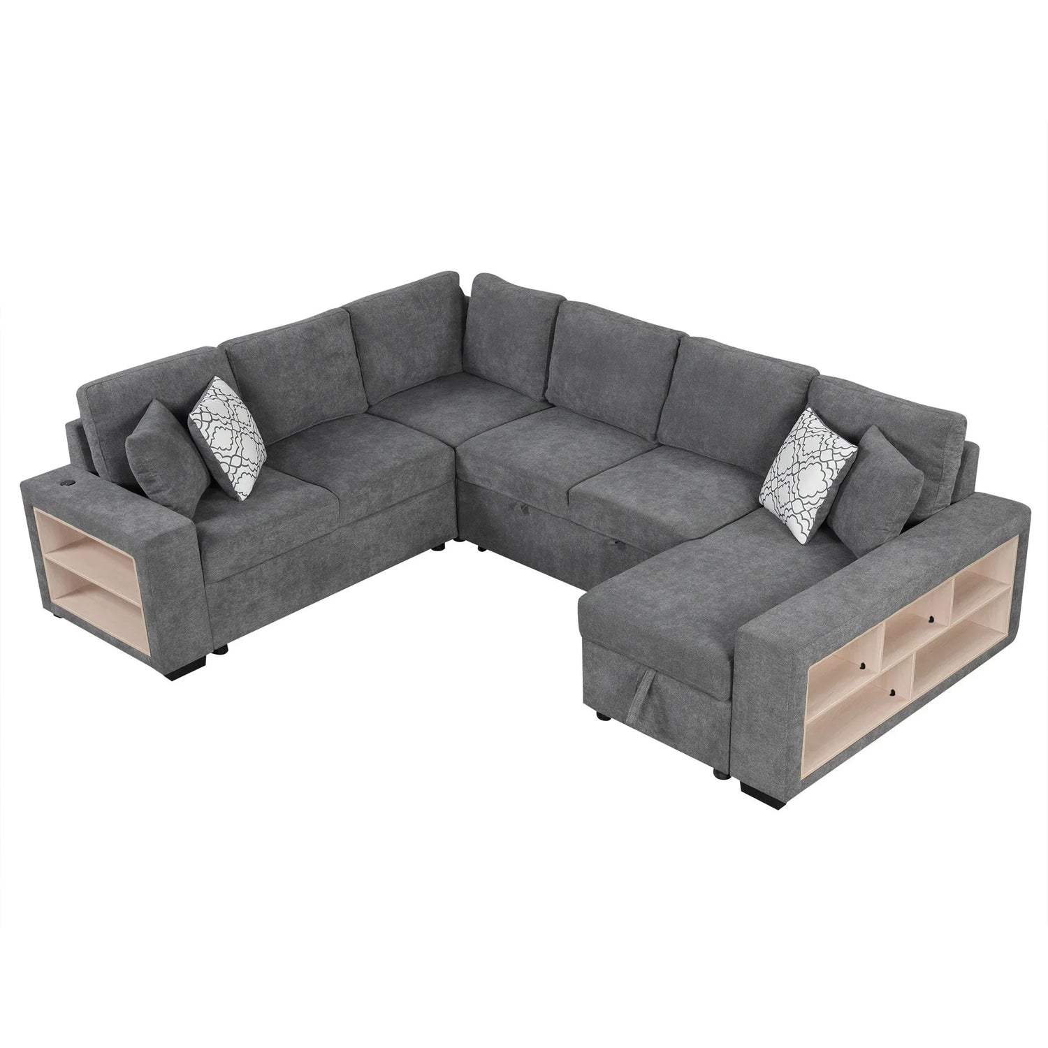 U-Shaped Sectional Sofa Pull-Out Sofa Bed With Two USB Ports, A Storage Chaise Lounge And Four Back Pillows For Living Room