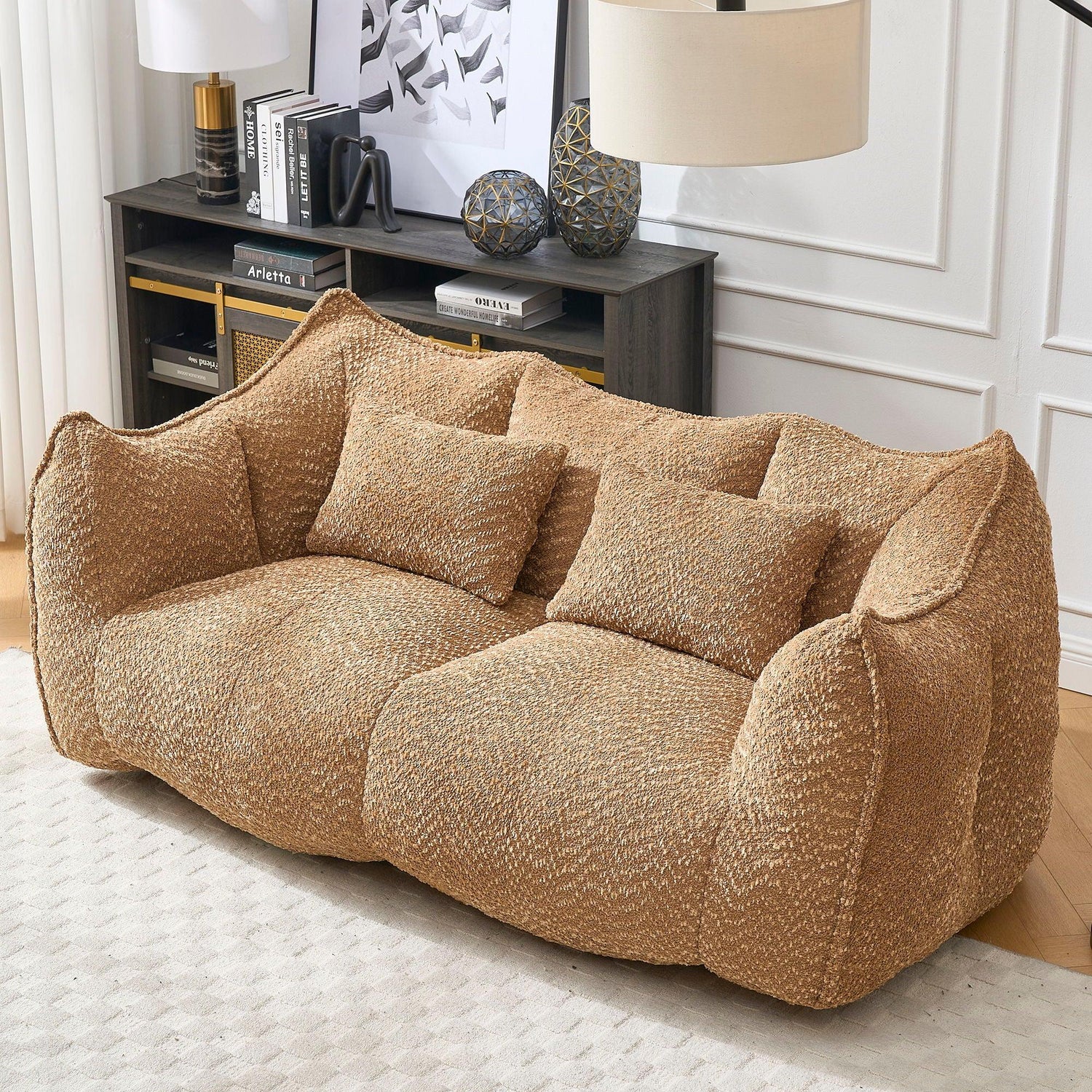 This generously proportioned dual beanbag chair is designed for two people who want the relaxed comfort of a lounge chair with the supportive feel of foam—perfect for game nights, movie marathons, or a cozy reading nook in a casual living room or bedroom. The low-slung, sculpted silhouette and soft chenille-like bouclé surface create an approachable, modern look that layers easily into contemporary and Scandinavian-inspired interiors.