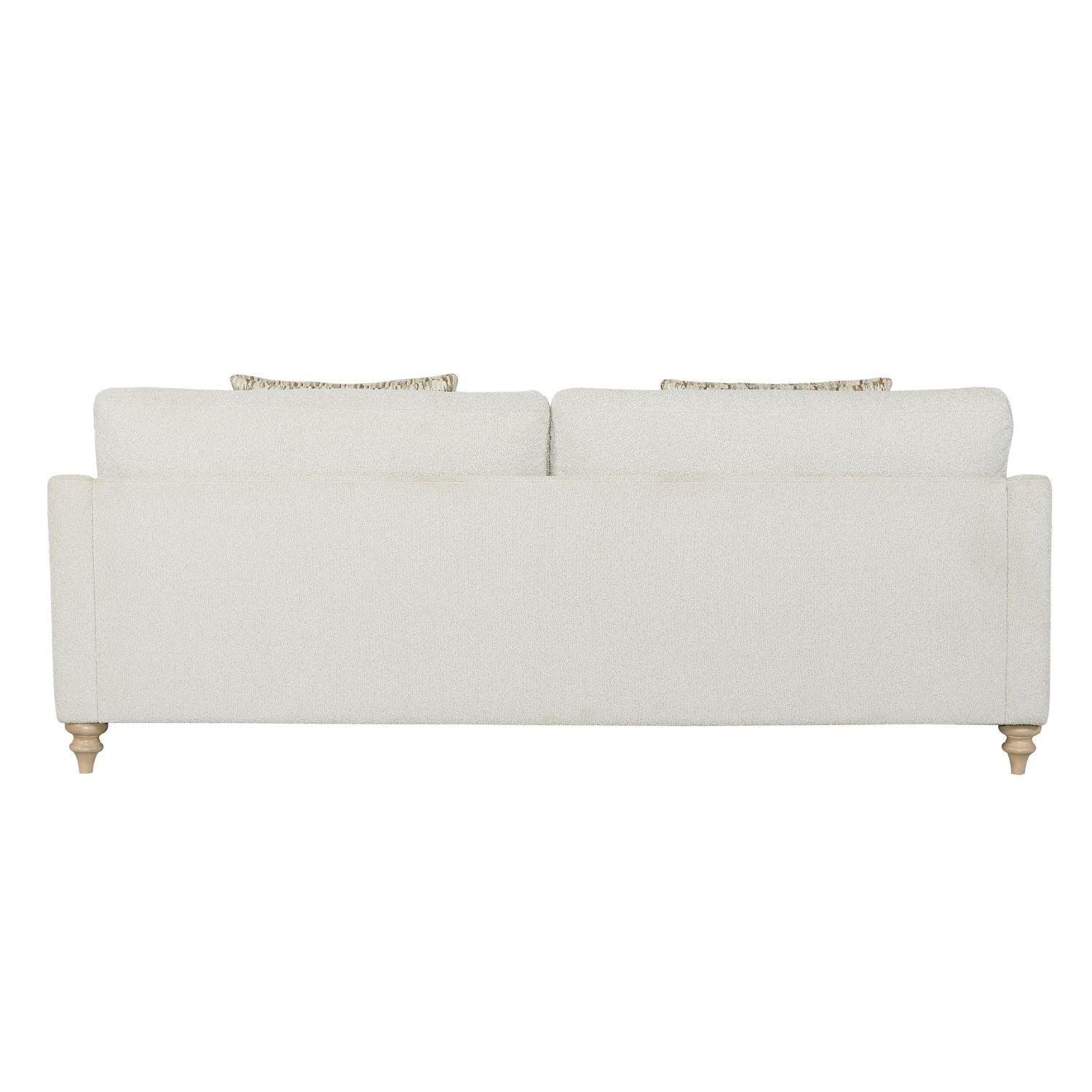 Color & finish: Off white polyester upholstery with a soft, textured (bouclé-like) appearance; turned wood legs in a light natural finish. Natural fibers and screen displays may show slight variation in tone and texture.
