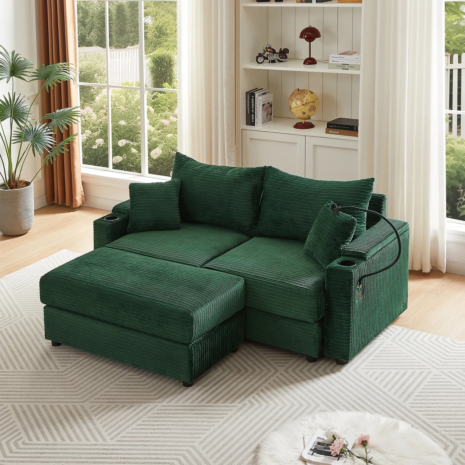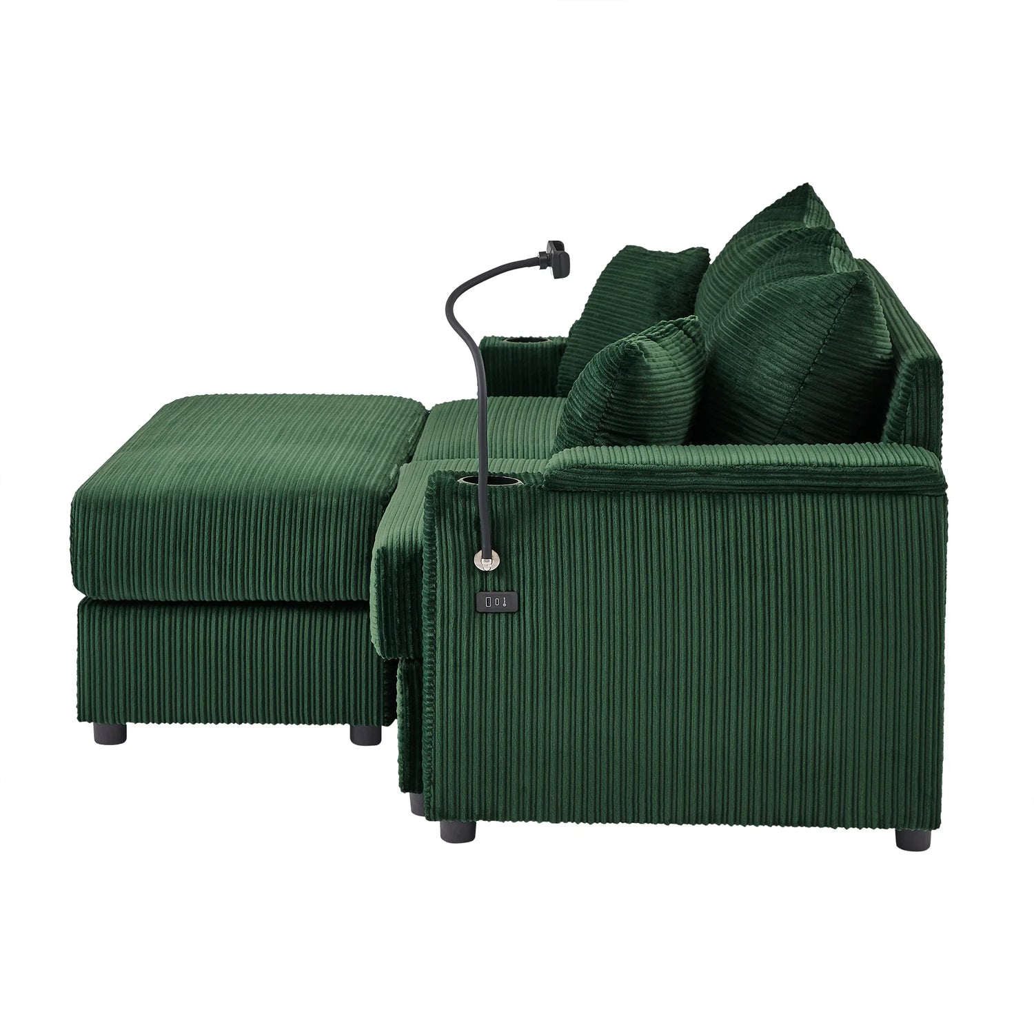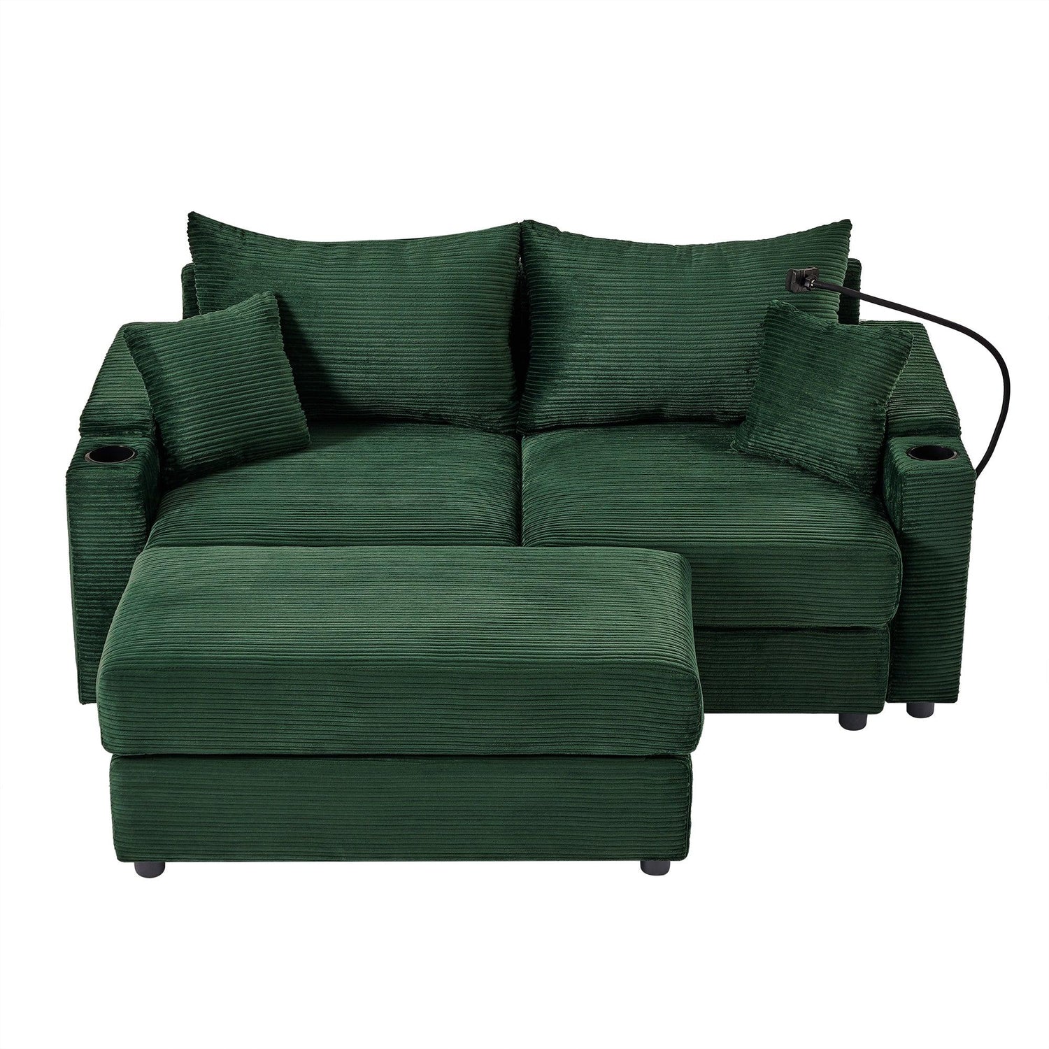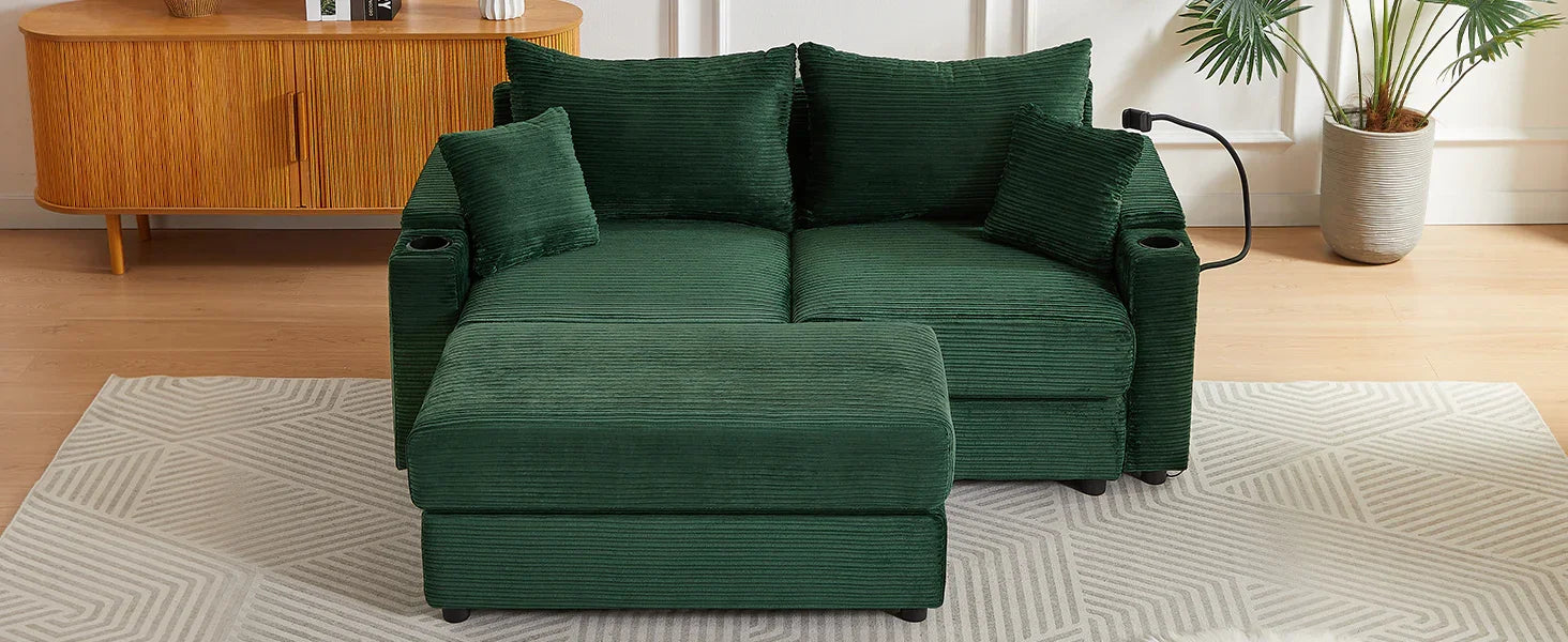 Elevate your relaxation with this versatile loveseat featuring premium functionality and comfort. The movable ottoman can be positioned as a chaise lounge for unwinding or a coffee table for convenience. Hidden storage armrests provide discreet compartments for keeping your space tidy. A built-in phone holder offers a hands-free solution for video calls or entertainment. Equipped with two USB ports, this sofa ensures your devices stay charged while you relax. Two built-in cup holders provide a secure spot for beverages, minimizing spills. Upholstered in soft and durable pinwale corduroy, it adds a plush, sophisticated touch to any living room.