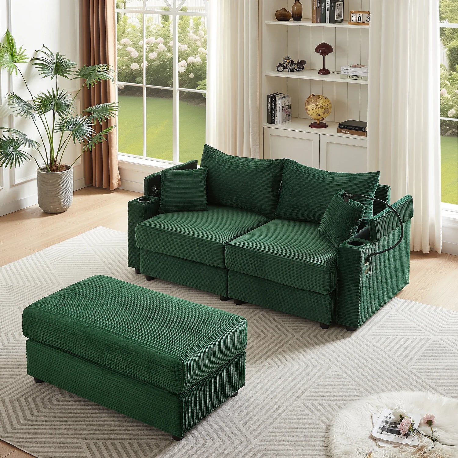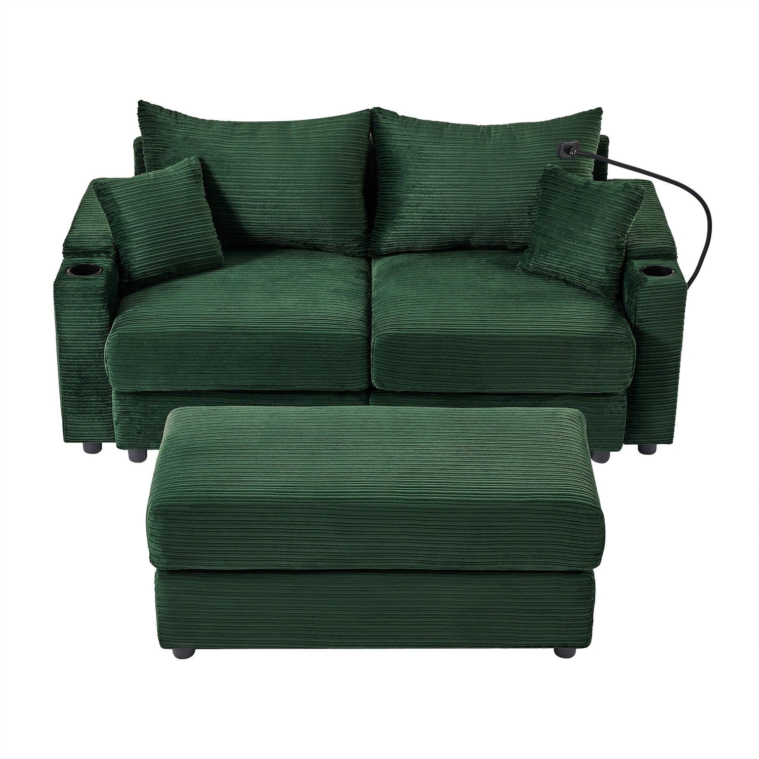 Sofa and Ottoman With Storage, Two USB Ports, Two Cup Holders and Phone Holder - Green