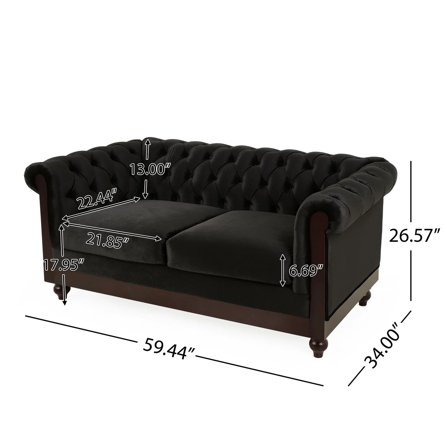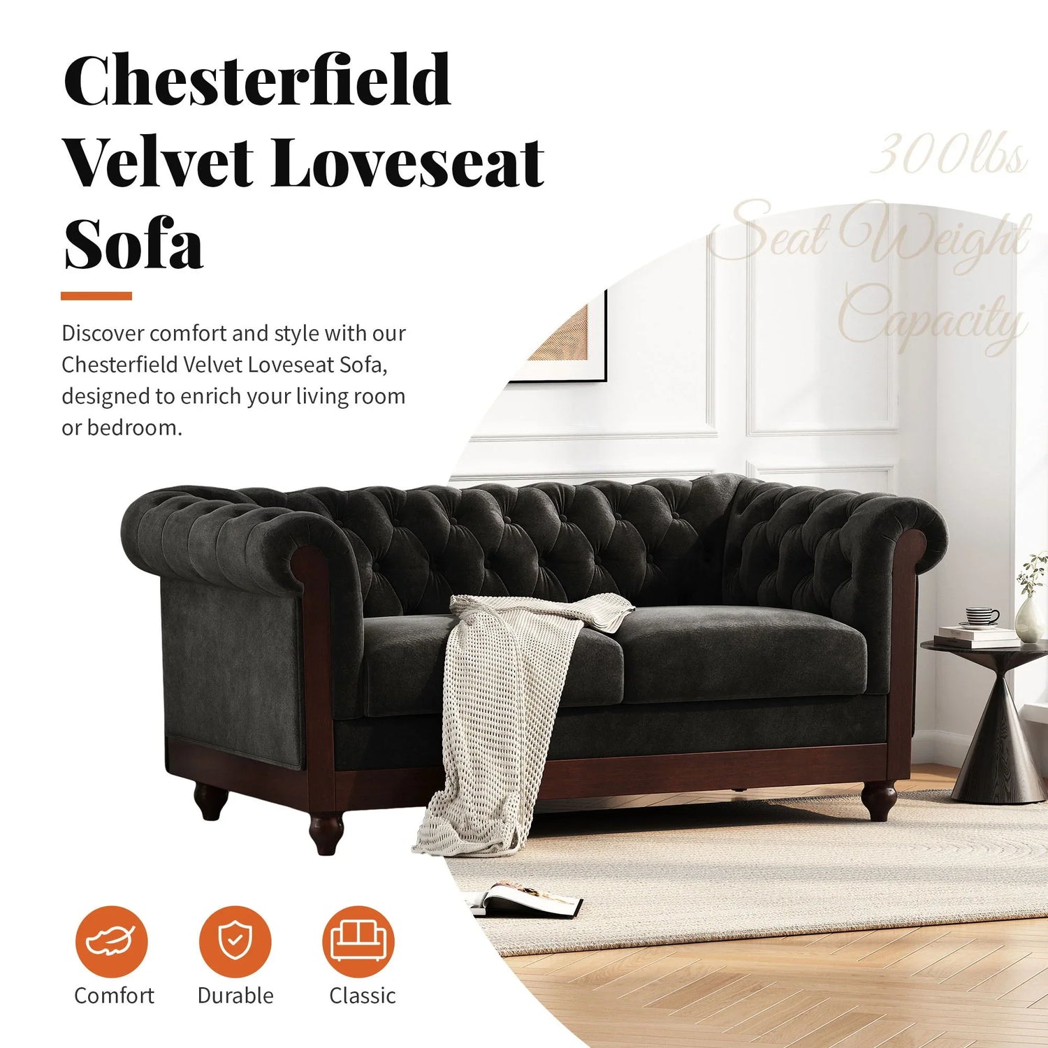Chesterfield Velvet Loveseat Sofa, 2 Person Rolled Arm Upholstered Couch - Black