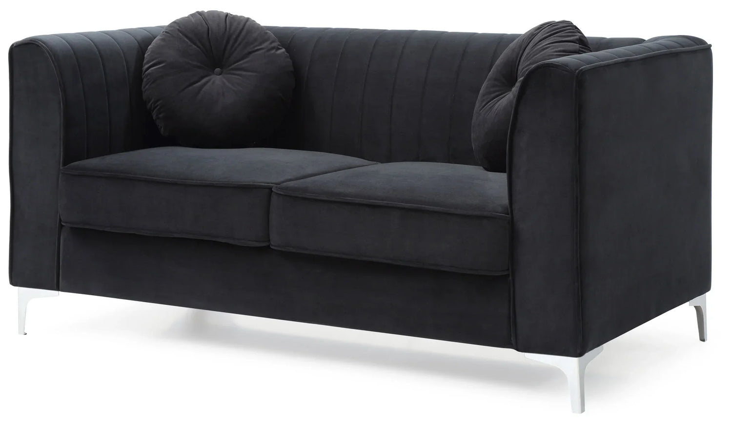 Upholstered in soft micro suede velvet and lifted on durable chrome legs, the Delray blends mid‑century influence with contemporary shine — an easy focal point for styled living rooms, boutique entry seating, or a cozy media nook. Two round accent pillows (shown) add layered texture and invite lounging; the construction emphasizes resilience and a refined, tailored look.