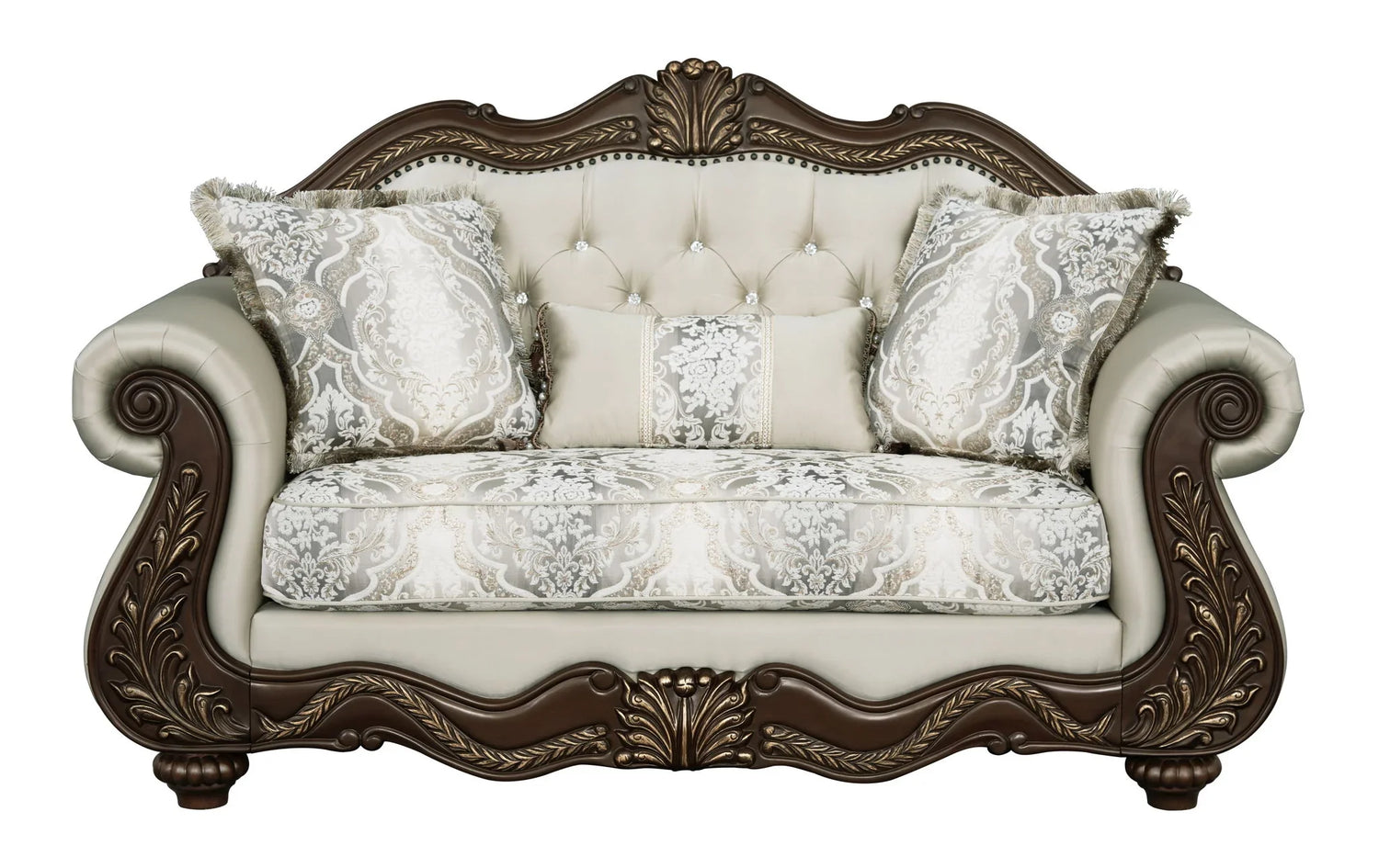 Built on a carved wood frame with a warm saddle‑brown finish and upholstered in a soft beige fabric, this stationary loveseat blends ornamental detail with everyday usability. Decorative tufting accented by crystal‑style buttons, a patterned seat and pillows trimmed with fringe, and sculpted wooden legs create a high‑touch look that reads luxe in both classic and transitional interiors.