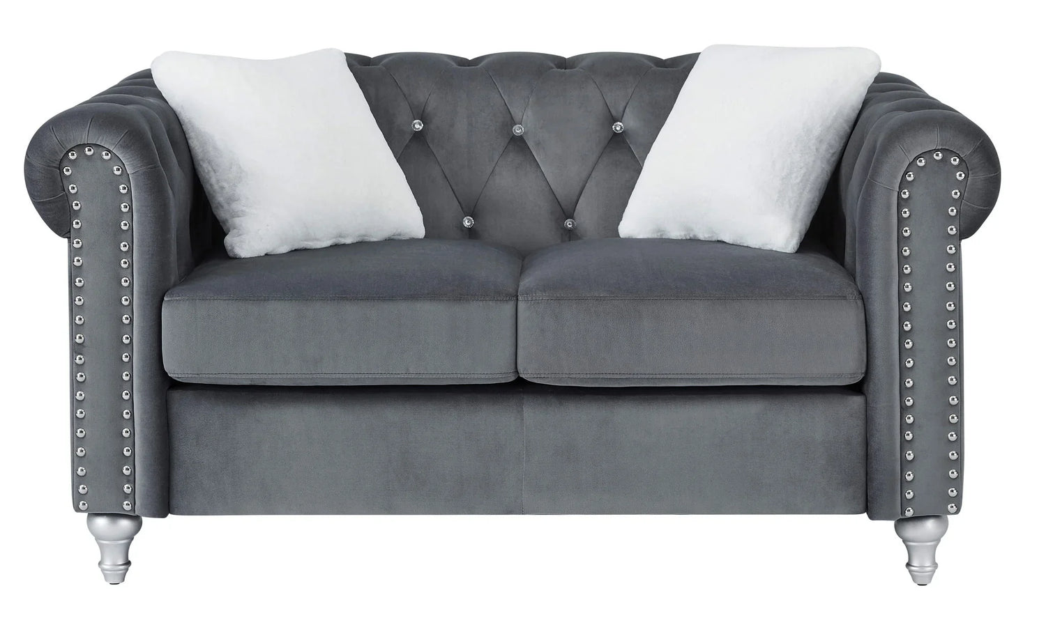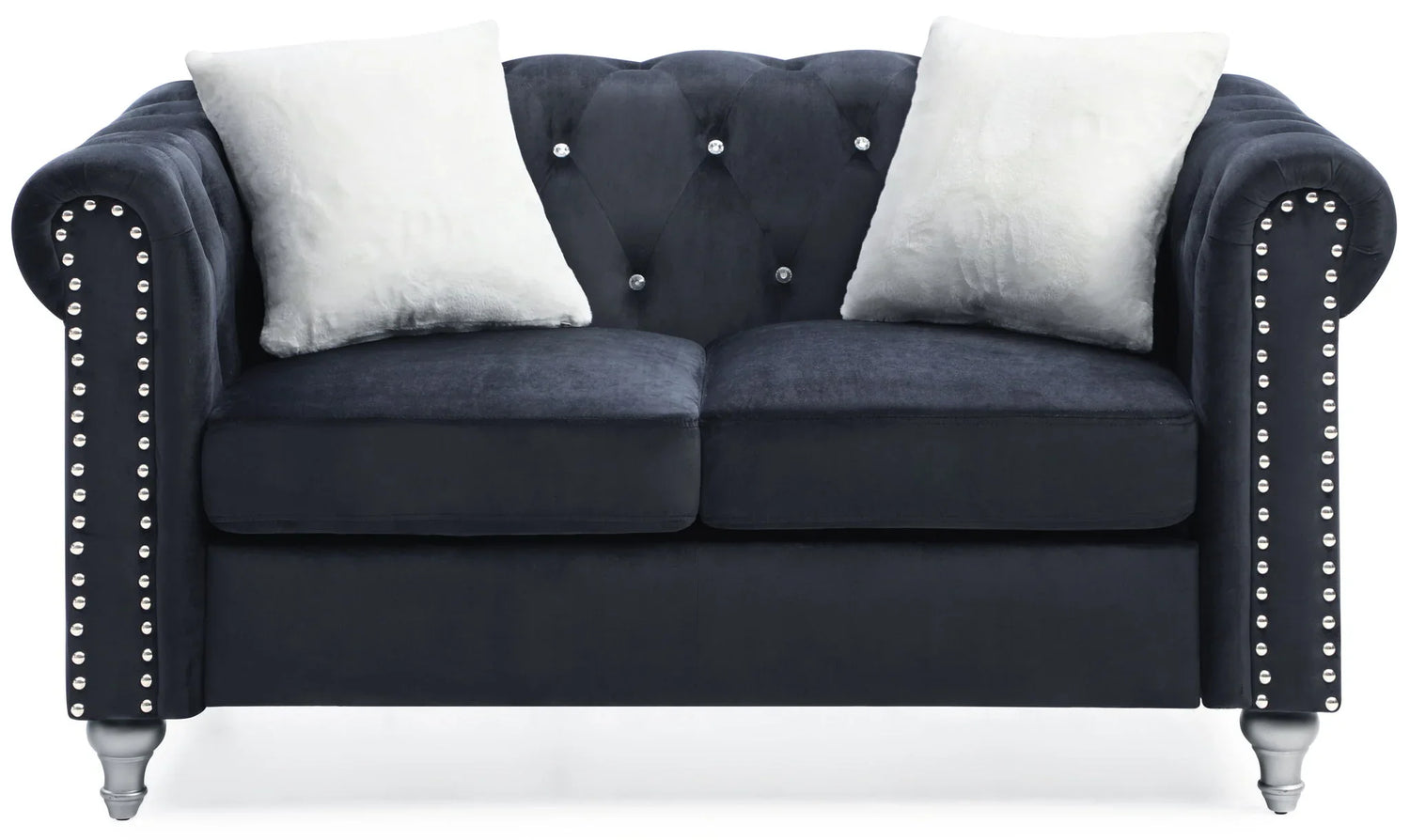 Pair with warm metallic accents and a soft, neutral rug to highlight the jeweled tufting and nailhead trim. Complement the rolled arms with rounded side tables and a table lamp to emphasize the loveseat’s classic silhouette while keeping the overall scheme contemporary.