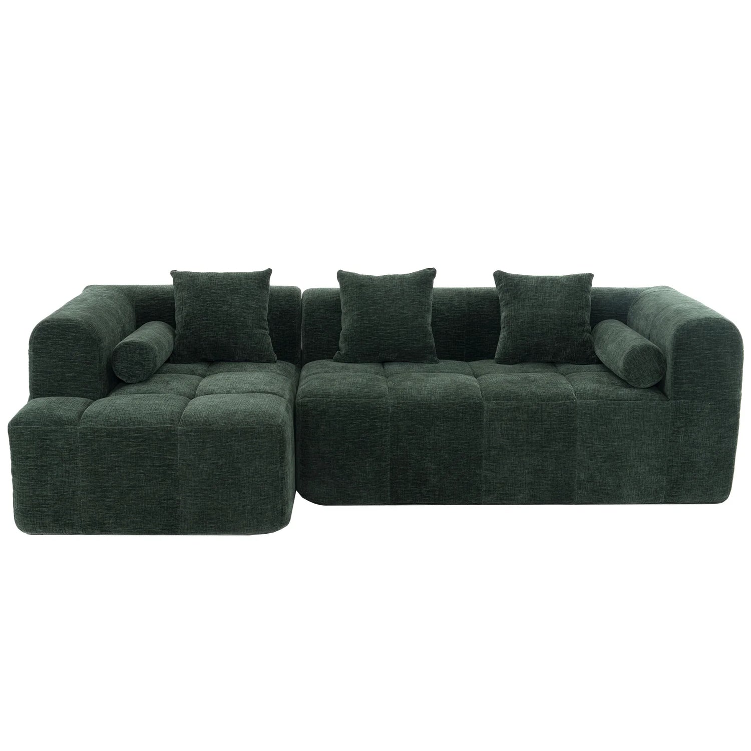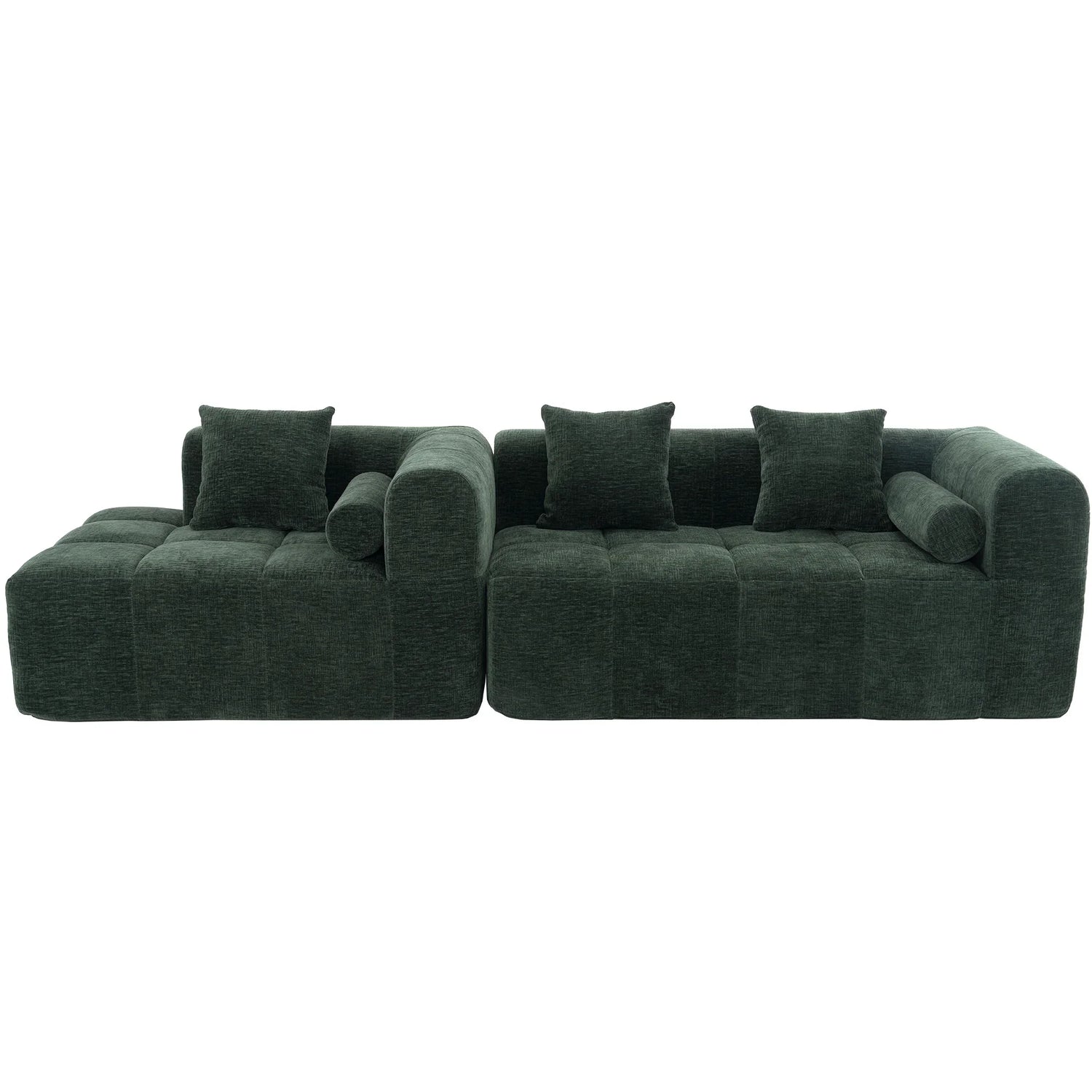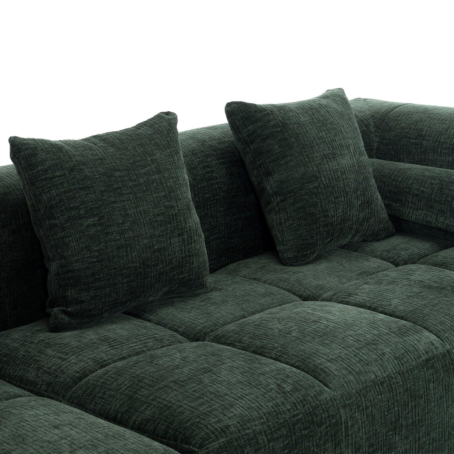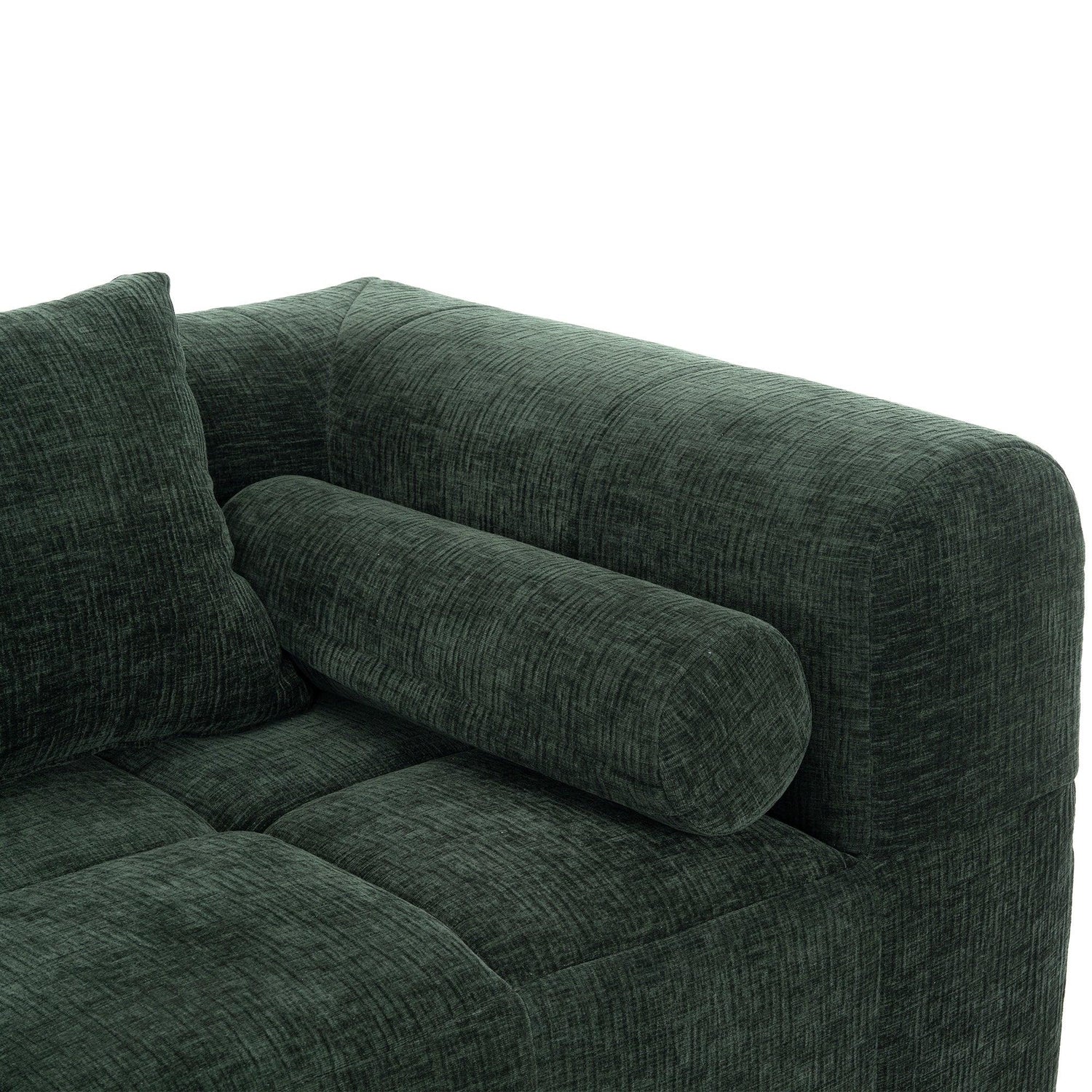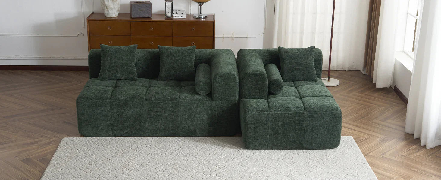 Upholstered in soft chenille in a rich green (leaning toward deep forest green with warm olive undertones) and finished with low‑sheen, tactile texture, the piece reads contemporary while nodding to classic tufting details. Construction features foam-filled cushions over pocket-spring support for resilient comfort; the modular sections make placement flexible in medium to large living spaces. Note: natural fiber texture and screen settings may cause slight color variation.