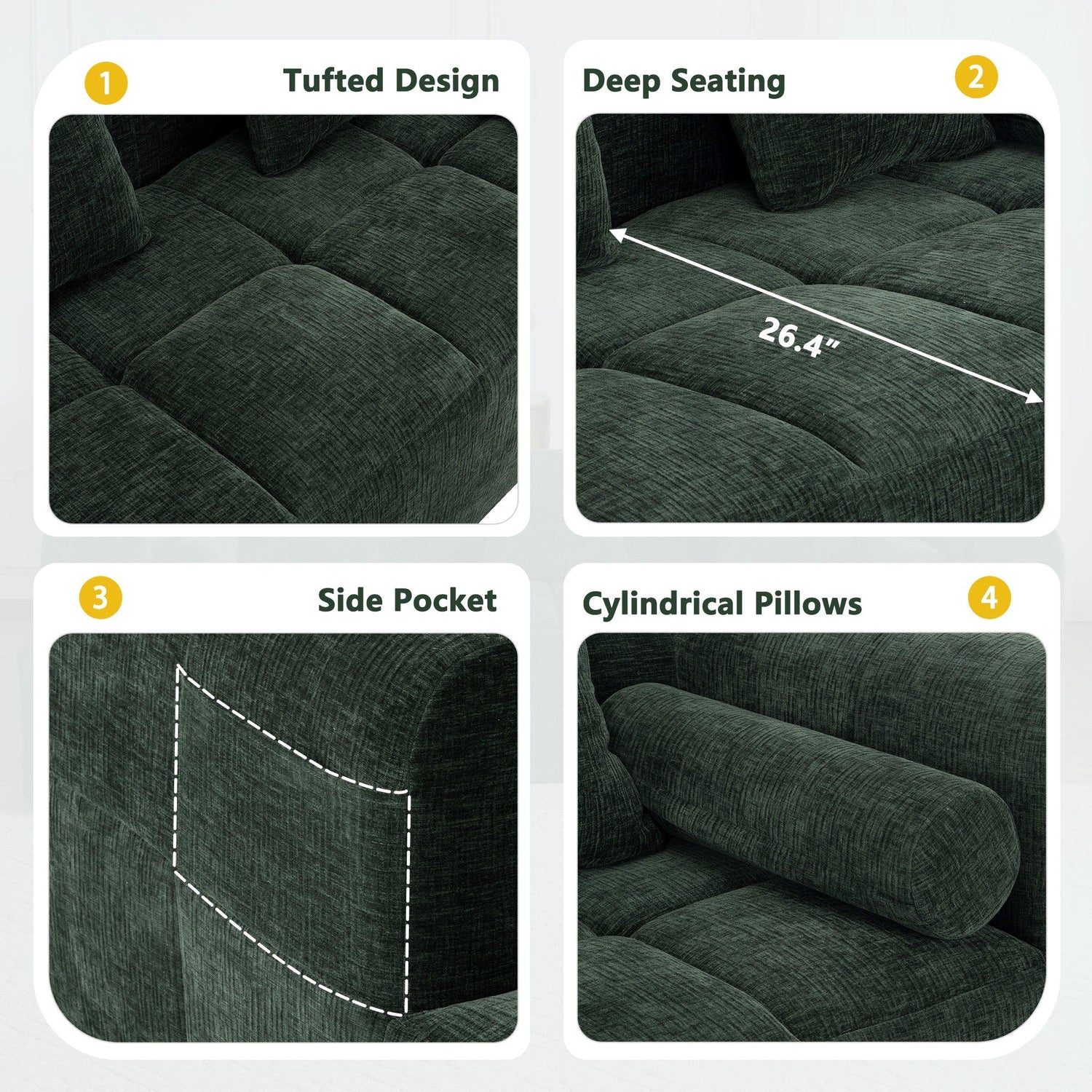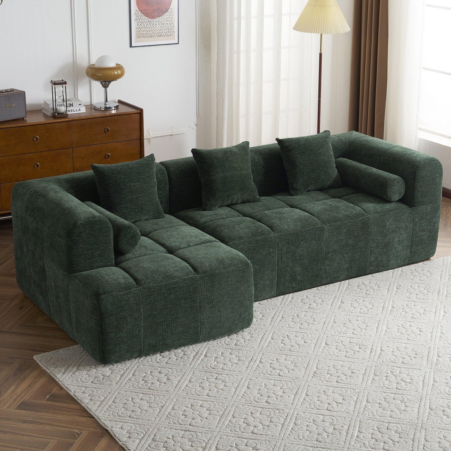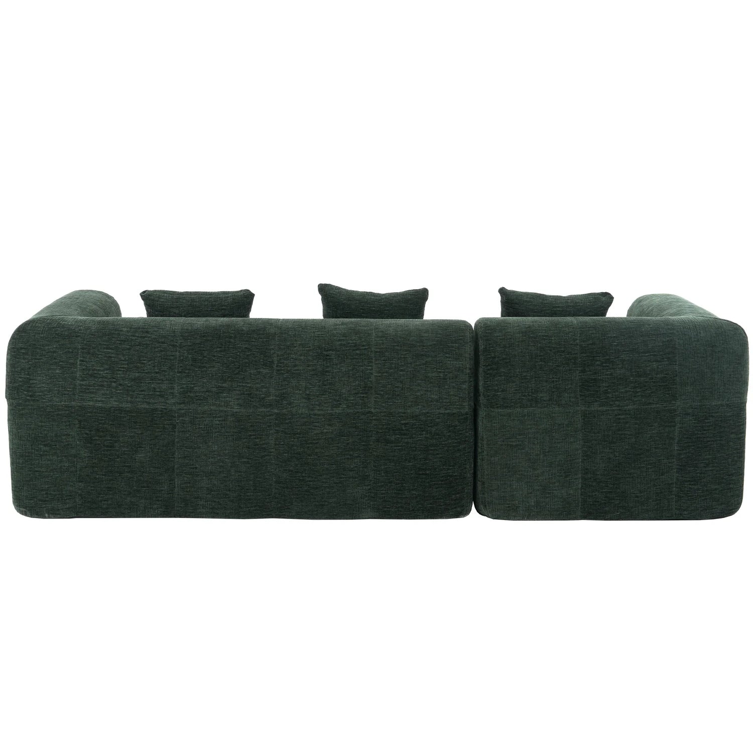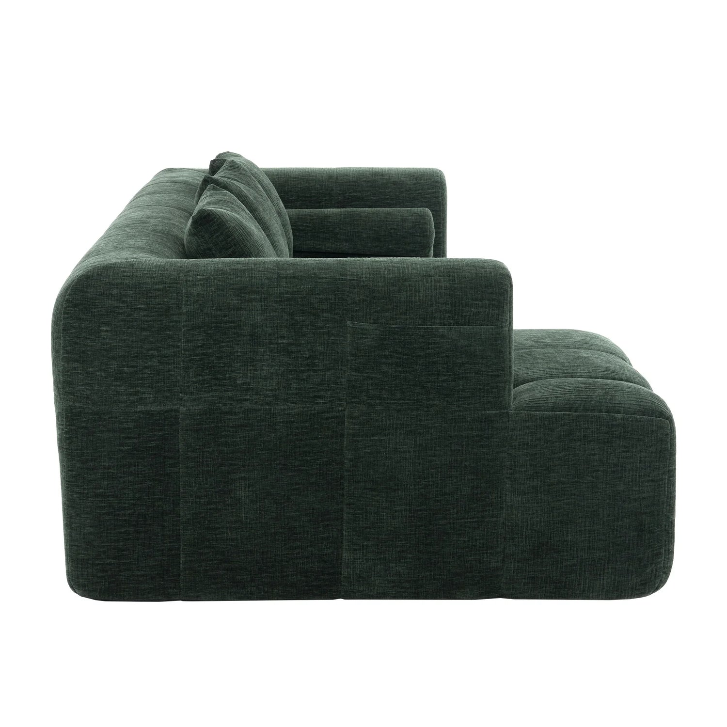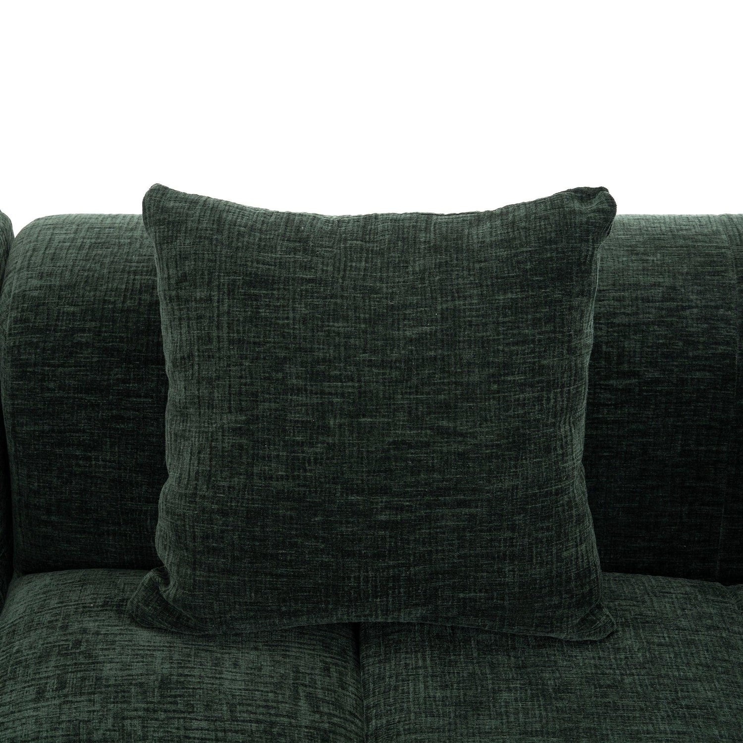 Upholstered in soft chenille in a rich green (leaning toward deep forest green with warm olive undertones) and finished with low‑sheen, tactile texture, the piece reads contemporary while nodding to classic tufting details. Construction features foam-filled cushions over pocket-spring support for resilient comfort; the modular sections make placement flexible in medium to large living spaces. Note: natural fiber texture and screen settings may cause slight color variation.