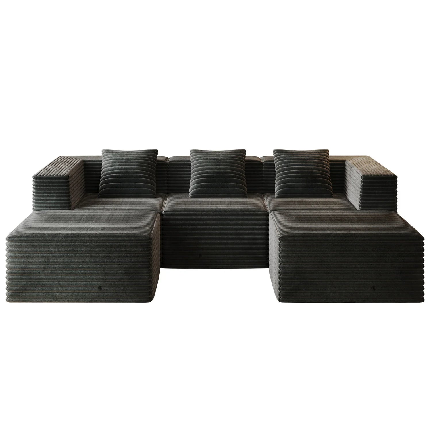 Use it as a relaxed conversation sofa, a movie-night sectional, or split the ottomans for extra seating and footrest options. The set’s modular construction makes rearranging simple and practical; cushions and ottomans work together to create daybed-style lounging or multiple distinct seats. The plush corduroy cover reads luxe and lived-in — note that natural variation in fabric texture and lighting may affect how the color appears on screen.