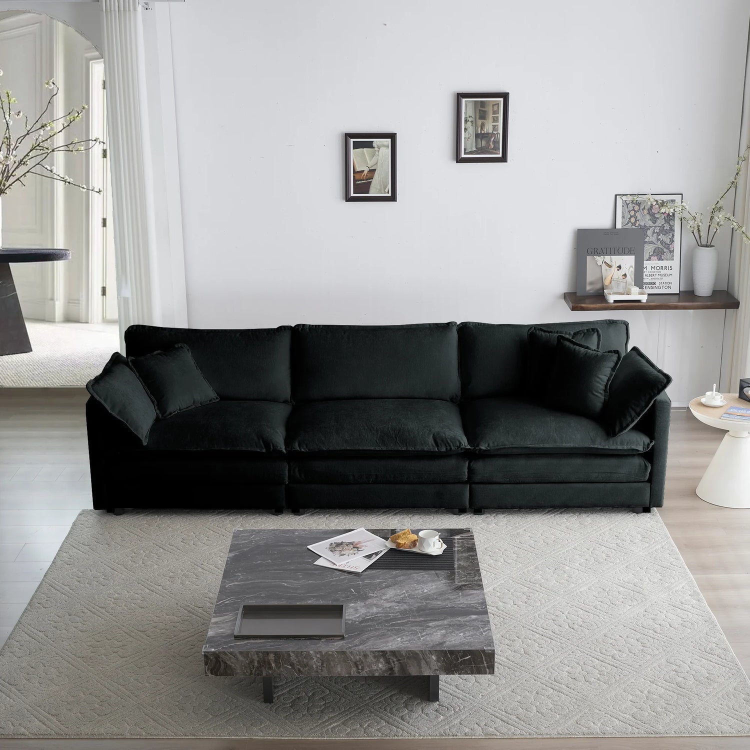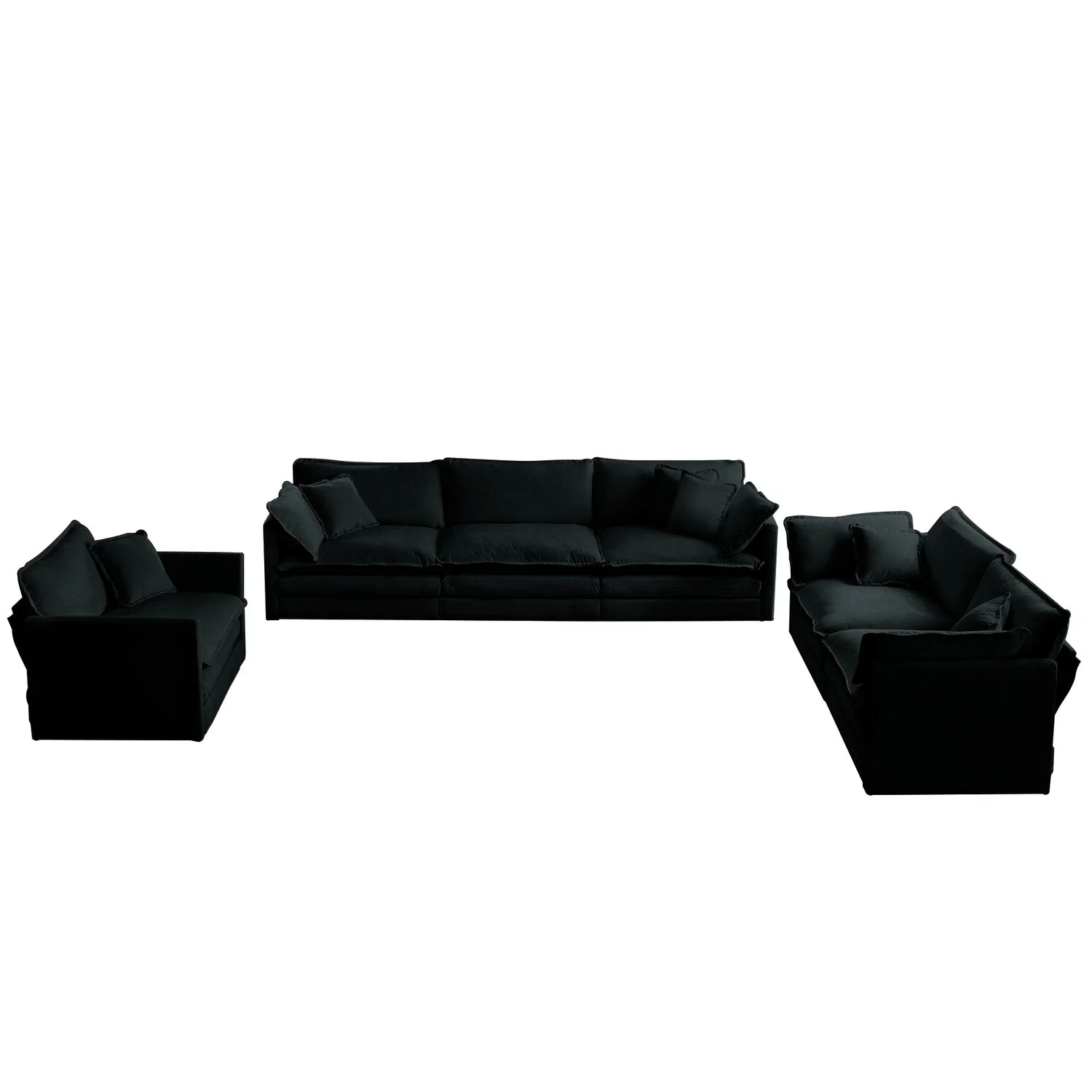 Designed for modern living rooms, family rooms, or roomy home offices, this Modern Chenille 3 Piece Living Room Set in black brings relaxed luxury and everyday comfort to shared spaces. The set includes a three-seater sofa, a two-seater sofa and an accent chair to seat six; plush, deep cushions and low, squared arms create an inviting silhouette that works with contemporary, transitional, or minimalist interiors.