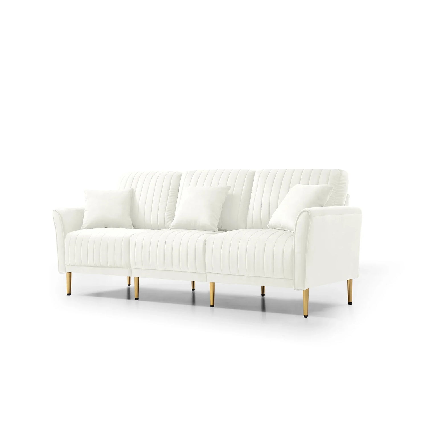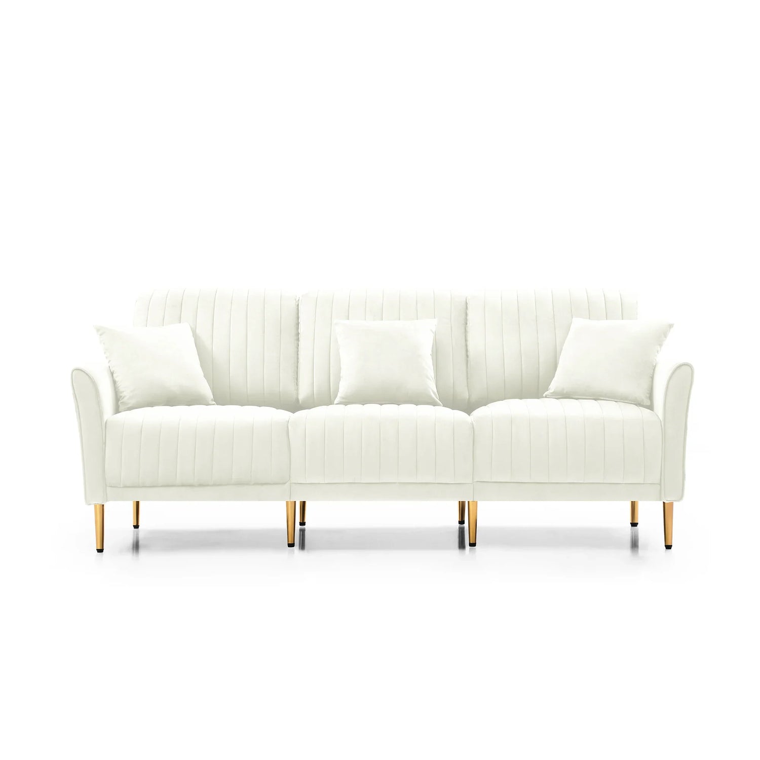 Enhance your living space with this art deco-inspired velvet sofa, blending mid-century charm with modern elegance. The premium soft velvet fabric cover is durable, non-pilling, and easy to clean, while the handcrafted channel tufting on the back and seat cushions adds a luxurious texture. Built with stable metal legs and a solid wood structure, this sofa offers lasting durability. The high-density sponge filling and high-strength springs provide excellent support and comfort, making it perfect for relaxation. Featuring reversible and removable back cushions and a fixed seat cushion for secure positioning, this sofa offers functionality and style. Easily customizable with additional middle seats to fit any living space, big or small. Assembly is simple and takes just 15 minutes, and detailed instructions are included.