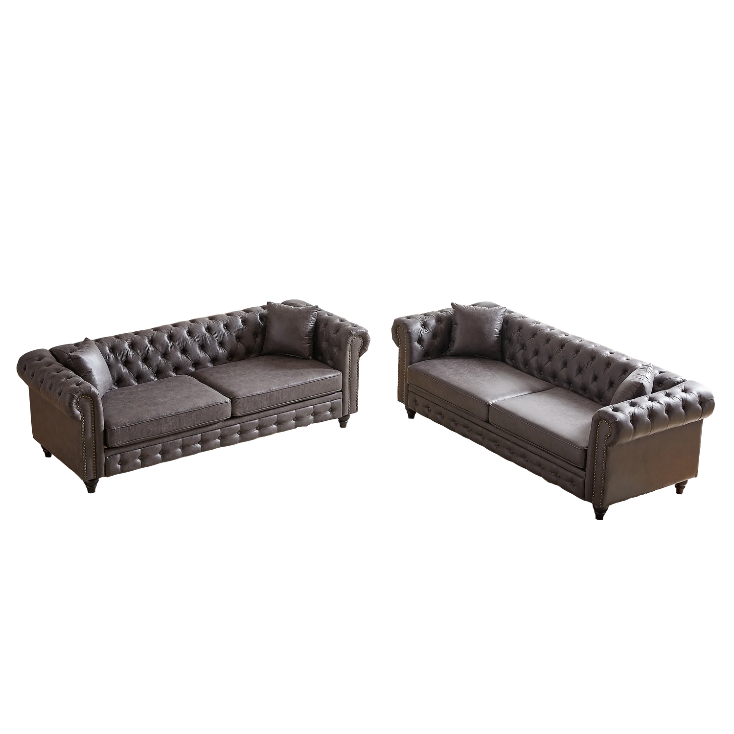 Designed for classic living rooms and multi-seat family spaces, this Traditional 2 Piece Living Room Set (2 Sofas) in gray brings stately Chesterfield-inspired form to everyday comfort. The low, tufted back, rolled arms and turned wooden legs create a formal silhouette that fits living rooms, den seating areas, or a large open-plan family room where you want both seating and style. With seating for up to six people across the two matching sofas, it’s a practical choice for households that host movie nights, game days, or casual get-togethers.