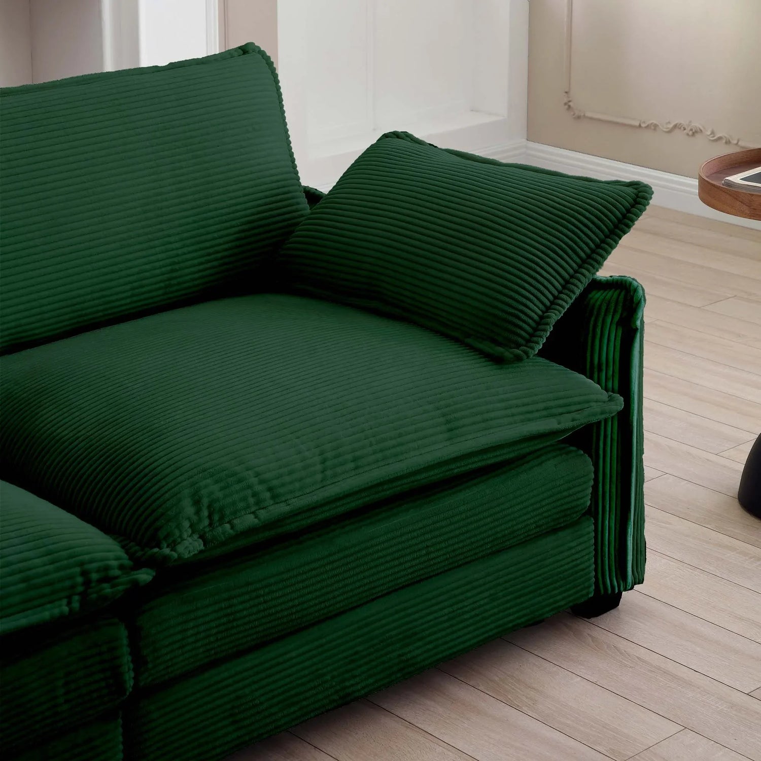 - Experience a perfect fusion of retro charm and modern style with this elegantly designed sofa. Its sleek lines and high-quality corduroy fabric create a sophisticated yet inviting atmosphere, making it a versatile centerpiece for any space. The ergonomic seat design, double-layered memory foam cushions, and removable armrests with soft throw pillows deliver unrivaled comfort for hours of relaxation. Flexible and customizable, this sofa is ideal for living rooms, bedrooms, home theaters, or play areas, with four colors—beige, camel, green, and grey—to complement any decor. Easy assembly with included tools ensures hassle-free setup, while regular care keeps it looking pristine.