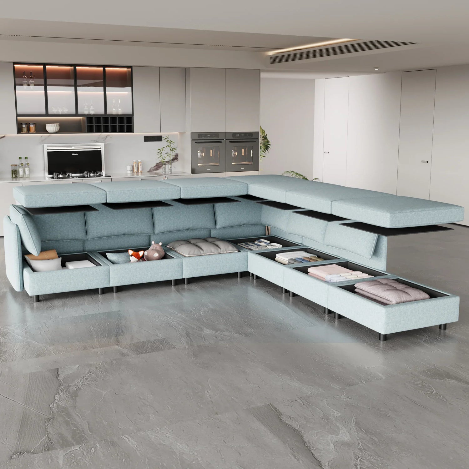 - Features: Modular configuration, built-in storage, high-density sponge cushions, sturdy wooden frame.