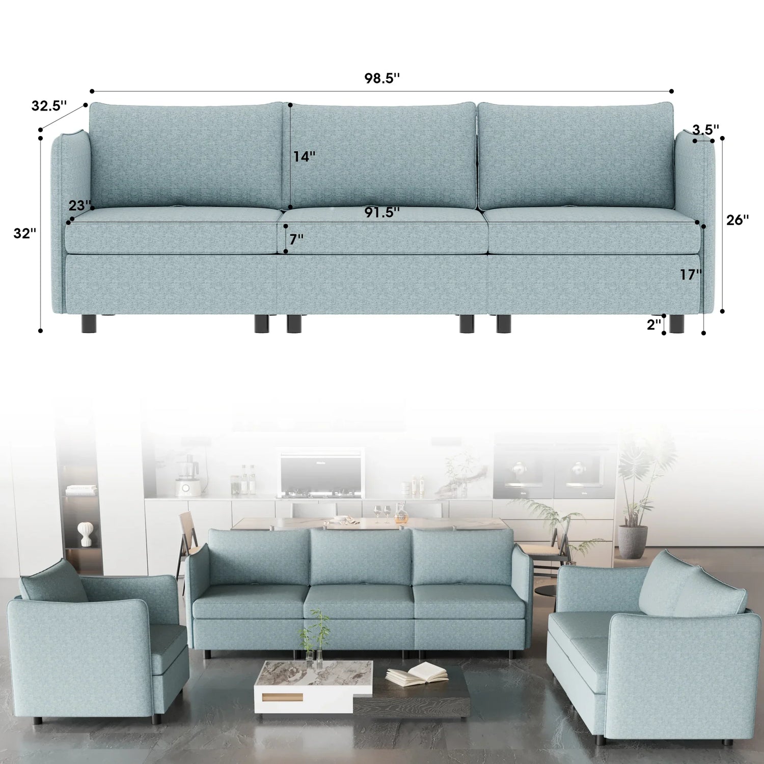 3 Piece Modular Living Room Set With Sofa, love seat and Chair, Sea Foam