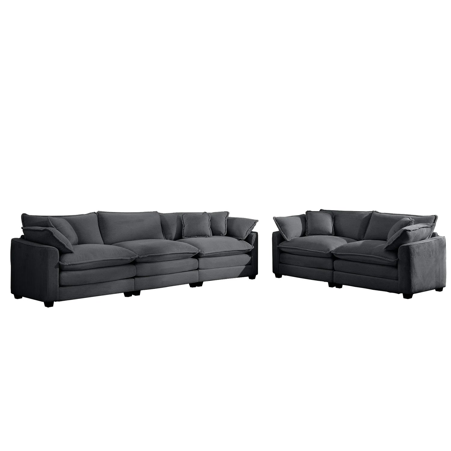 Modern families and style-conscious hosts will appreciate this Sofa and Loveseat Set — Gray for everyday living rooms, media rooms, or large open-plan spaces. Built to seat five comfortably, the set combines plush, oversized cushions with a low, supportive profile that invites lounging, conversation, and long movie nights. The corduroy upholstery gives the pieces a tactile, modern-casual look that layers easily with textured rugs and warm wood tones.