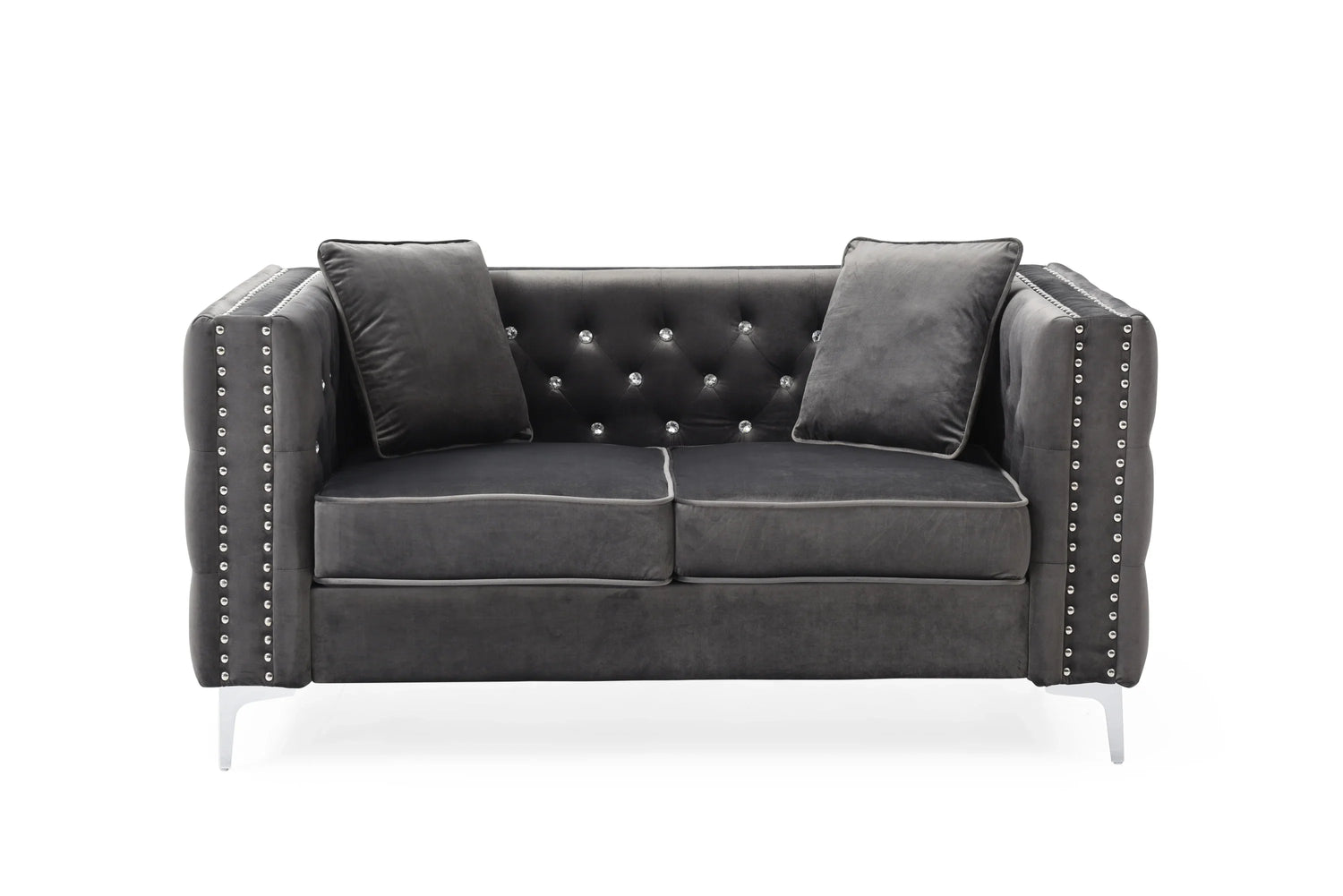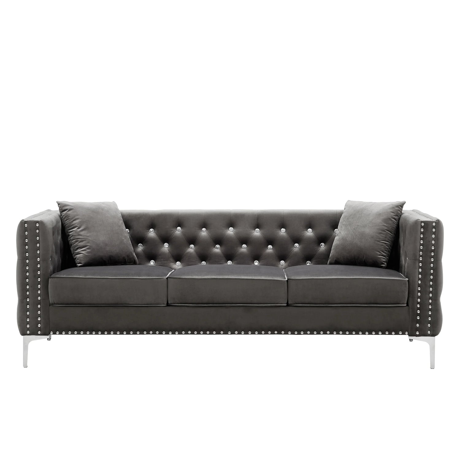 This 2 piece sofa and loveseat set is covered in soft velvet jeweled buttoned tufted on the outside and inside of the arms and backs. Pocketed coil cushion seats make this set comfortable and durable. Silver nailhead is trimmed and finished off with chrome-plated legs, and it also includes 4pcs throw pillows. KD design allows EZ delivery to any home or room and can be assembled in less than 30 minutes.