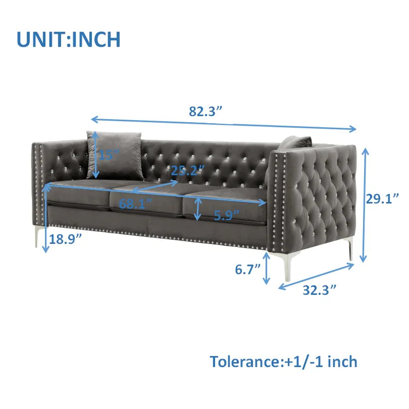 • Chesterfield Design: Square armrests, tufted details, and nailhead trim for a timeless look.