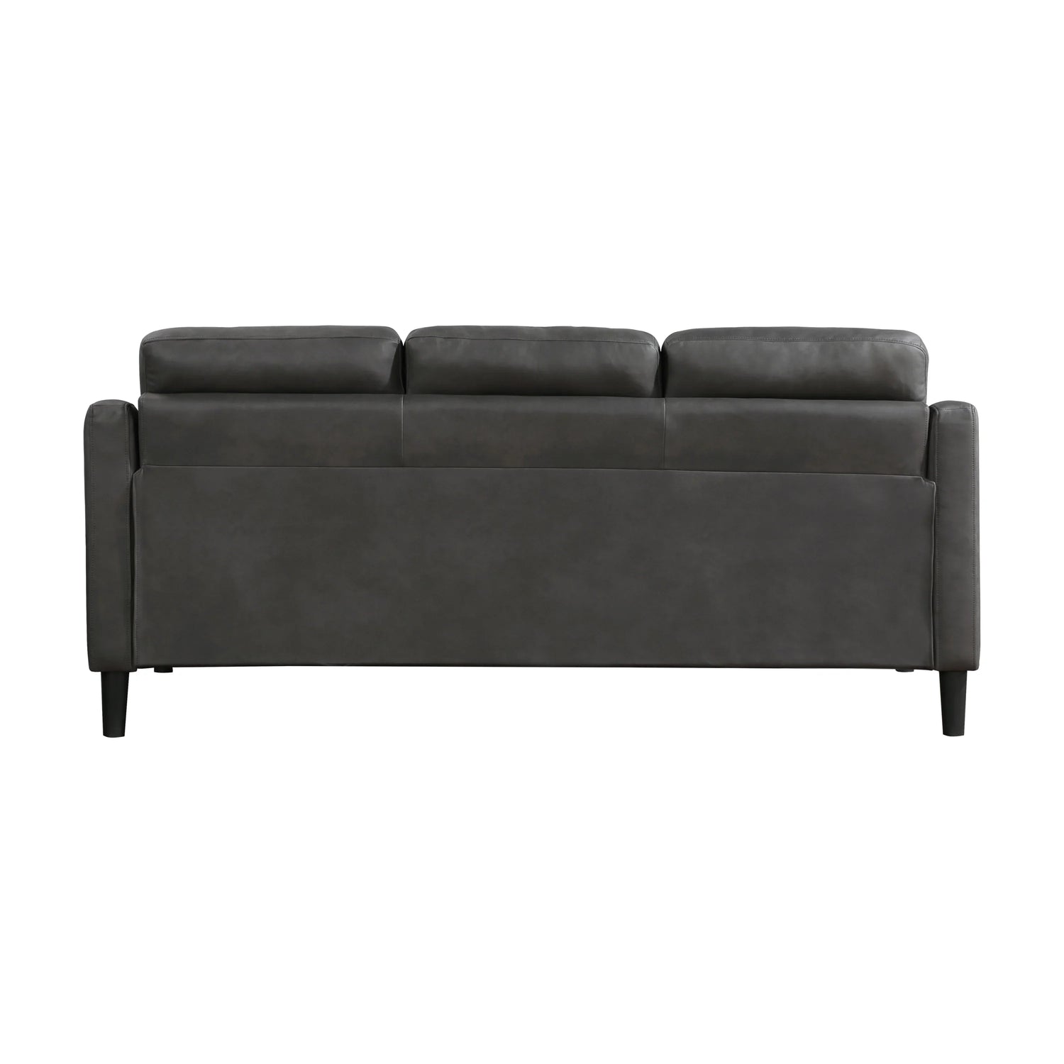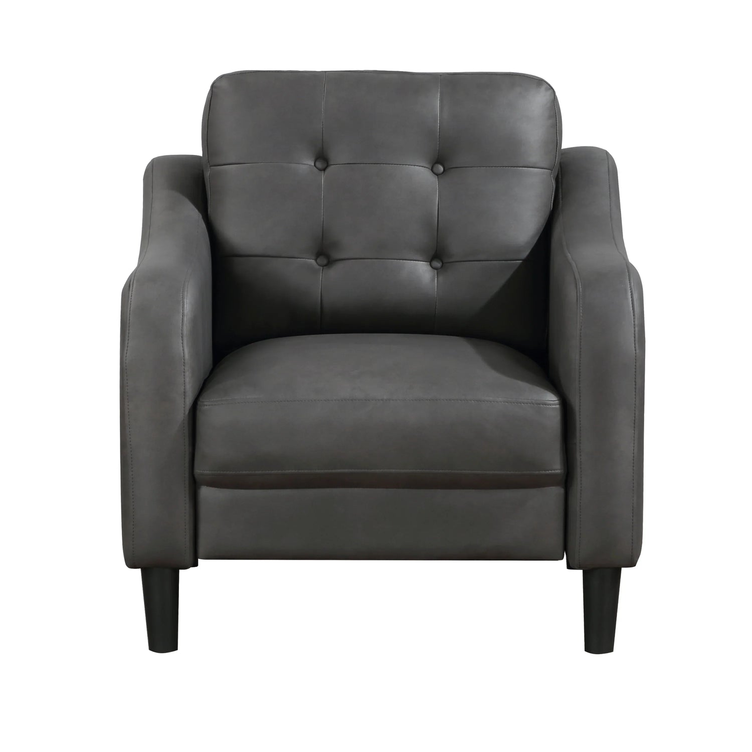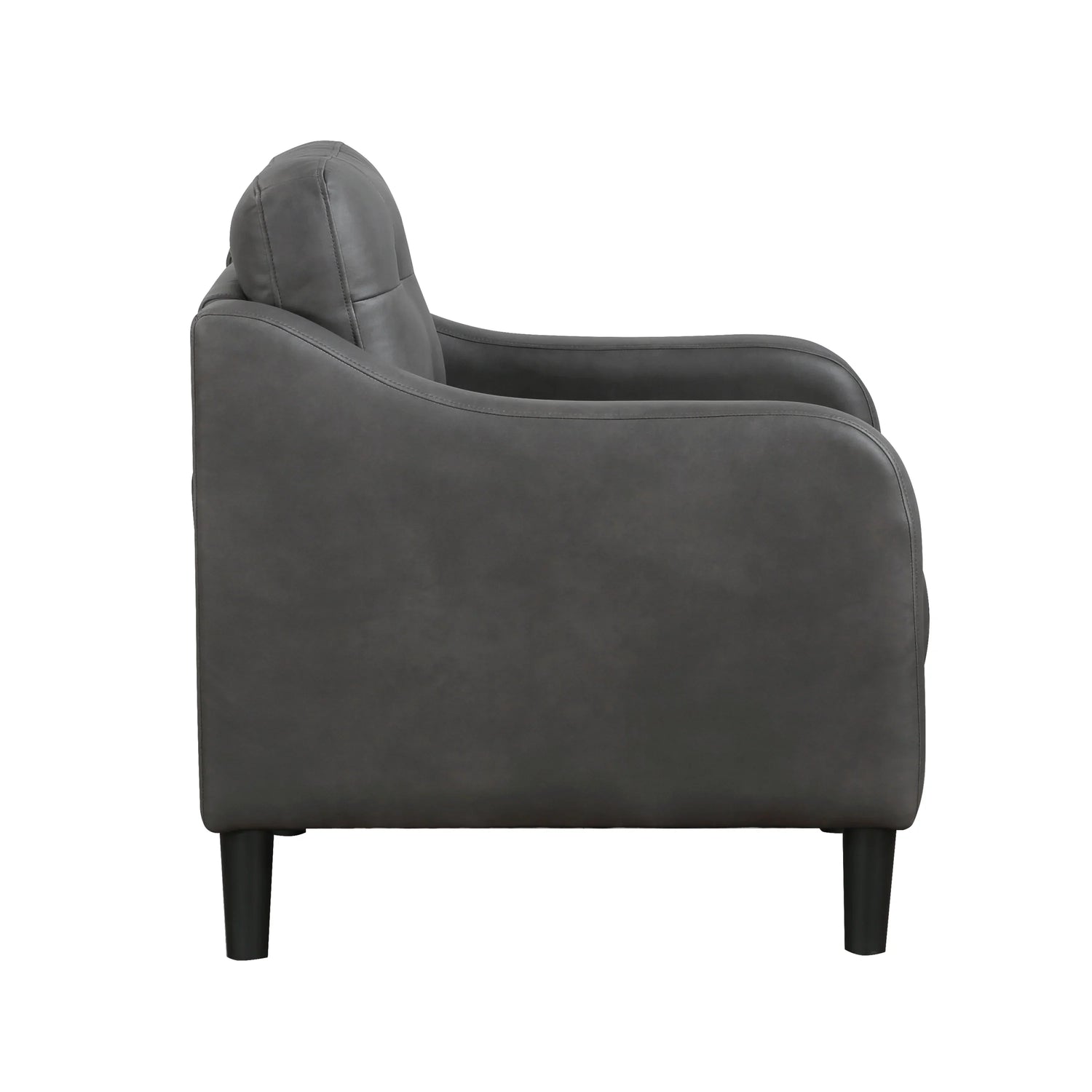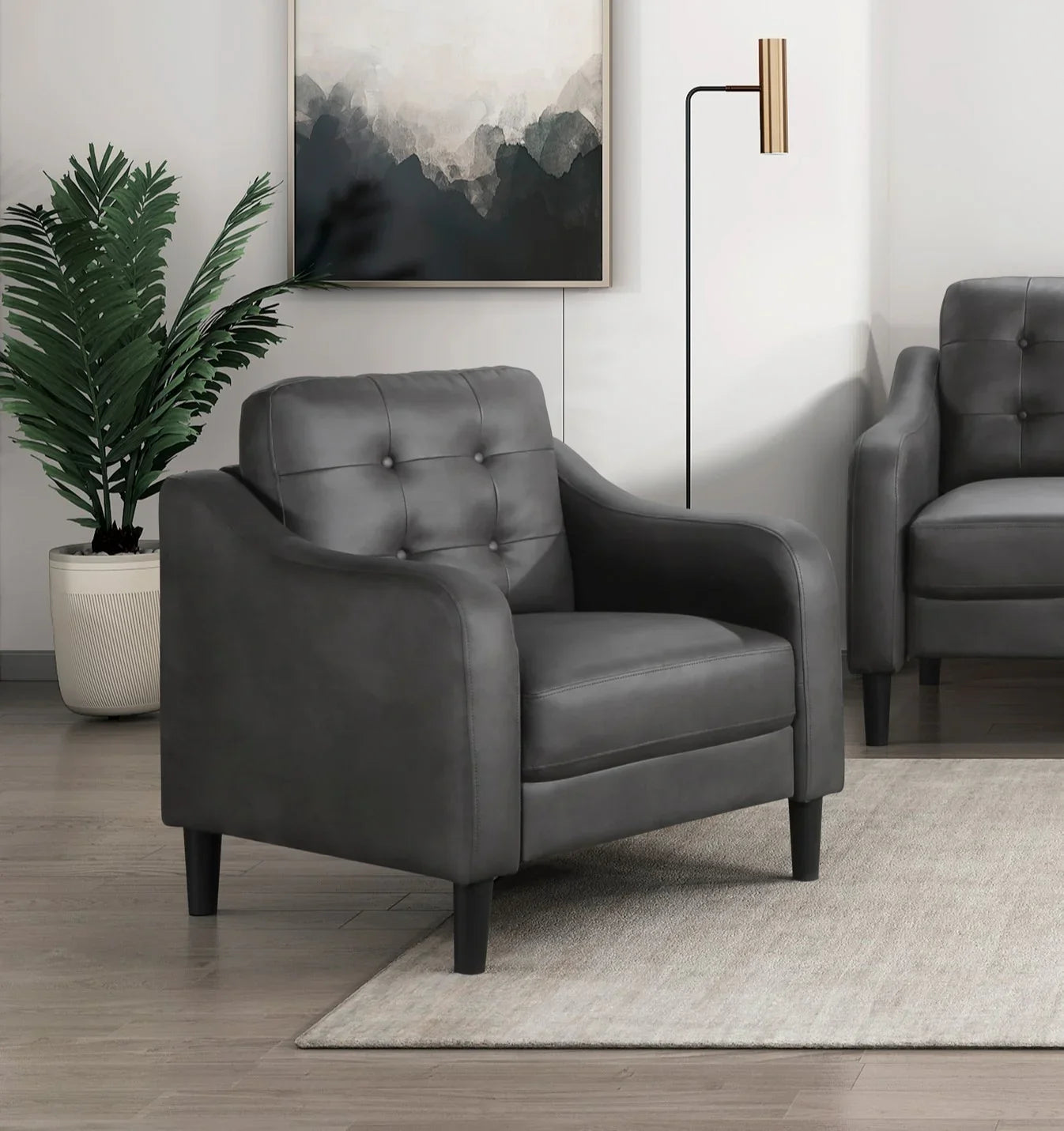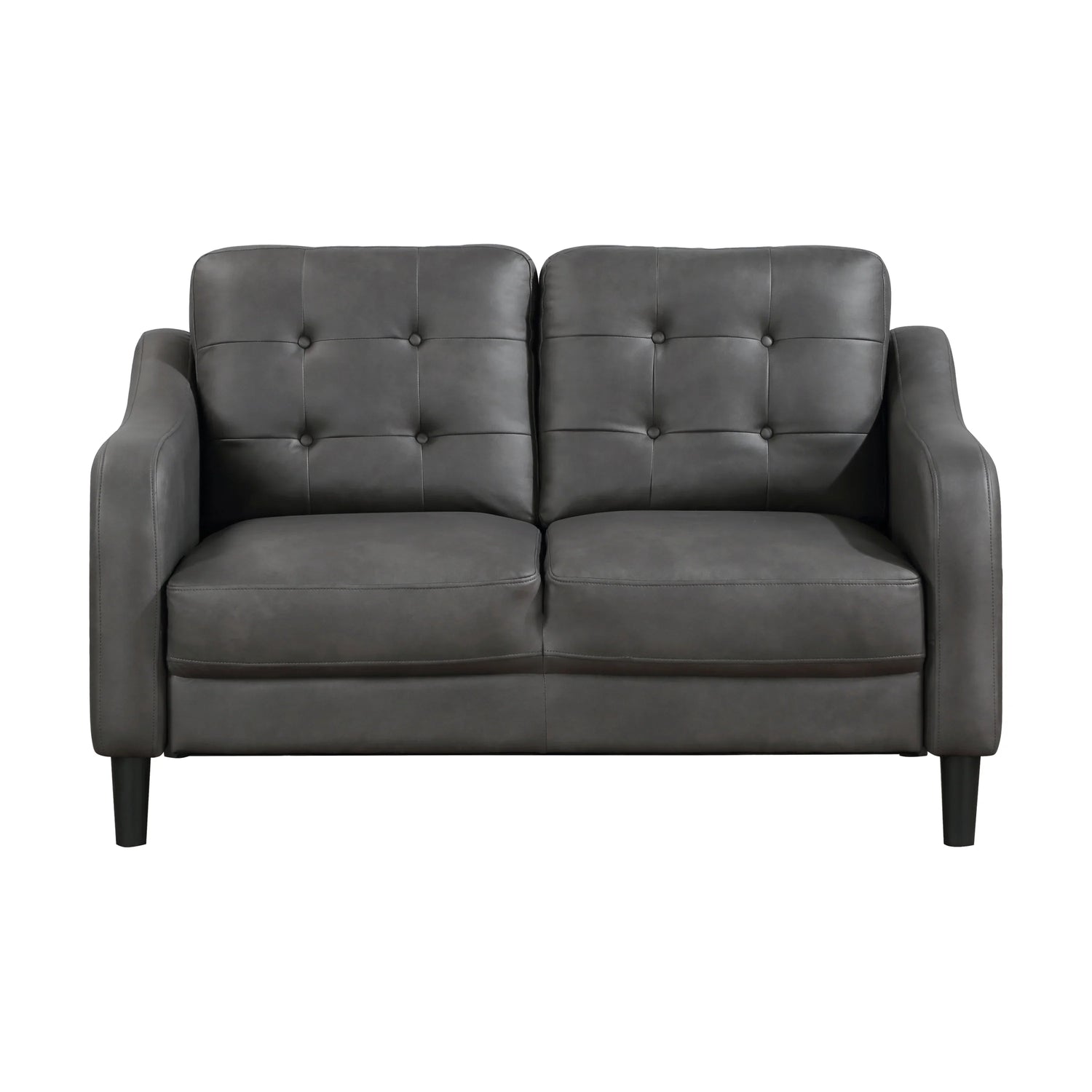 The Mallory Collection brings versatile style and comfort to your living room. Featuring a solid wood and plywood frame with foam padding over pocket coils, this set ensures durability and support. Upholstered in polished gray microfiber with elegant button-tufted detailing, it offers a transitional design that complements various decors. The contoured arms and attached back and seat cushions add to its refined comfort, while the black faux wood-finished feet complete the look. Weight capacity is 300 lbs per seat.